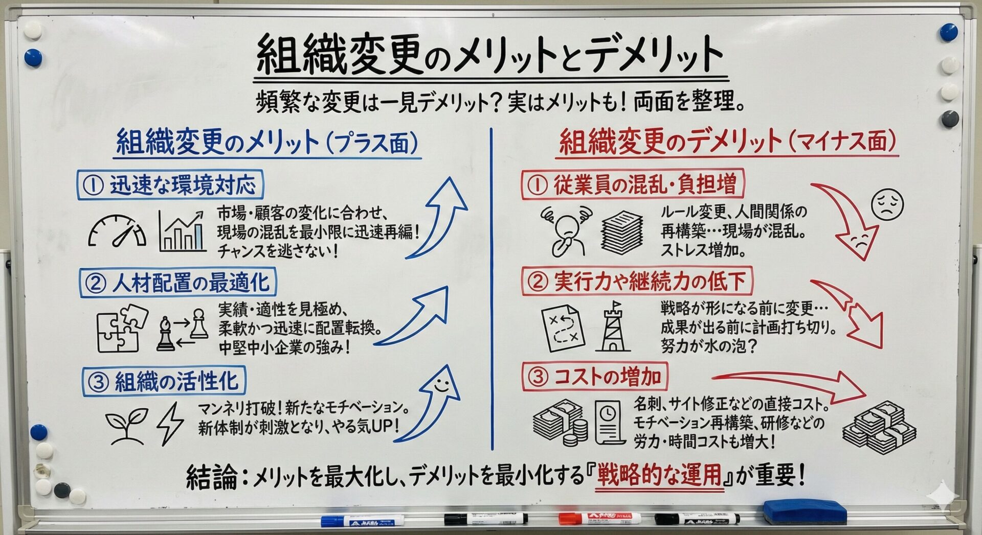 頻繁に組織変更を行うのは一見デメリットばかりが目につきがちですが、実際にはメリットも存在します。ここではメリット・デメリットの両面を整理しておきましょう。