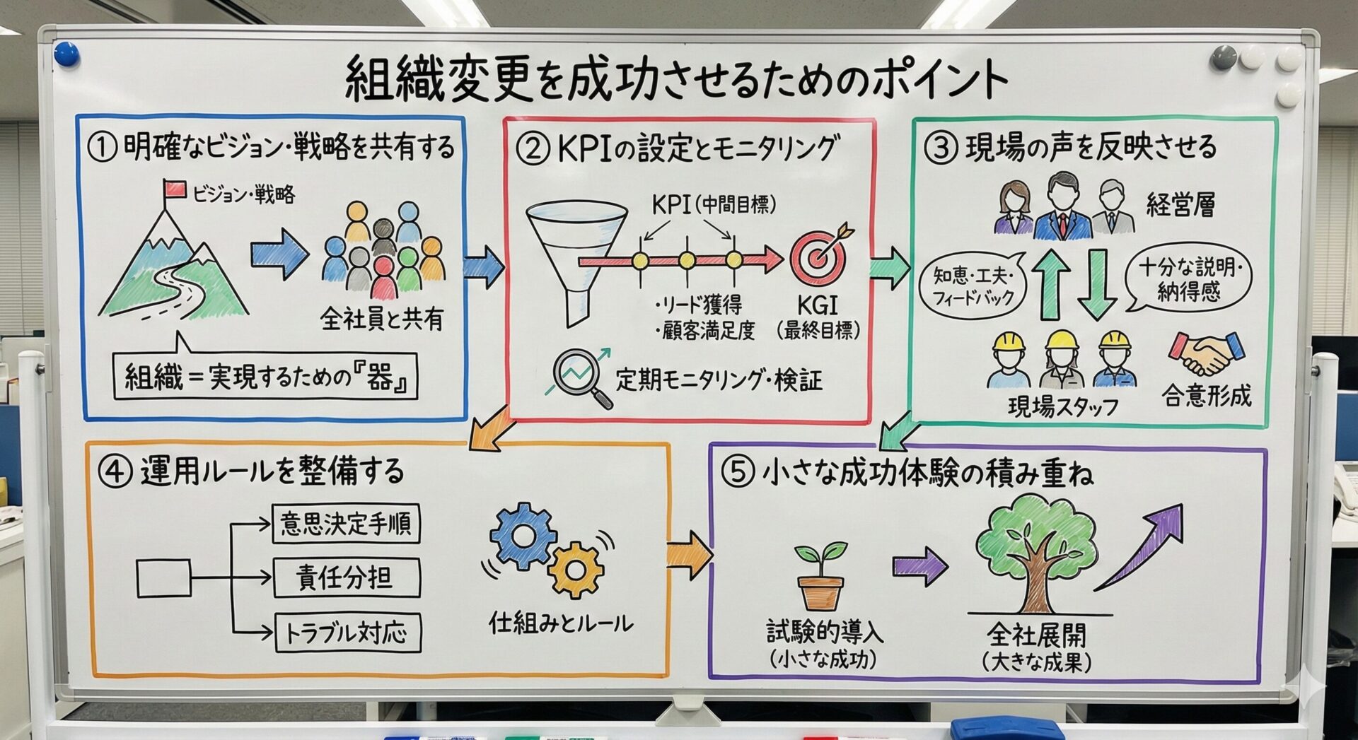 頻繁に組織変更を行う企業には、それなりの理由があります。しかし、仮に理由があったとしても、その方法が適切でなければ現場は疲弊してしまい、成果は出にくくなってしまいます。以降では、組織変更を成功に導くためのポイントを5つお伝えします。