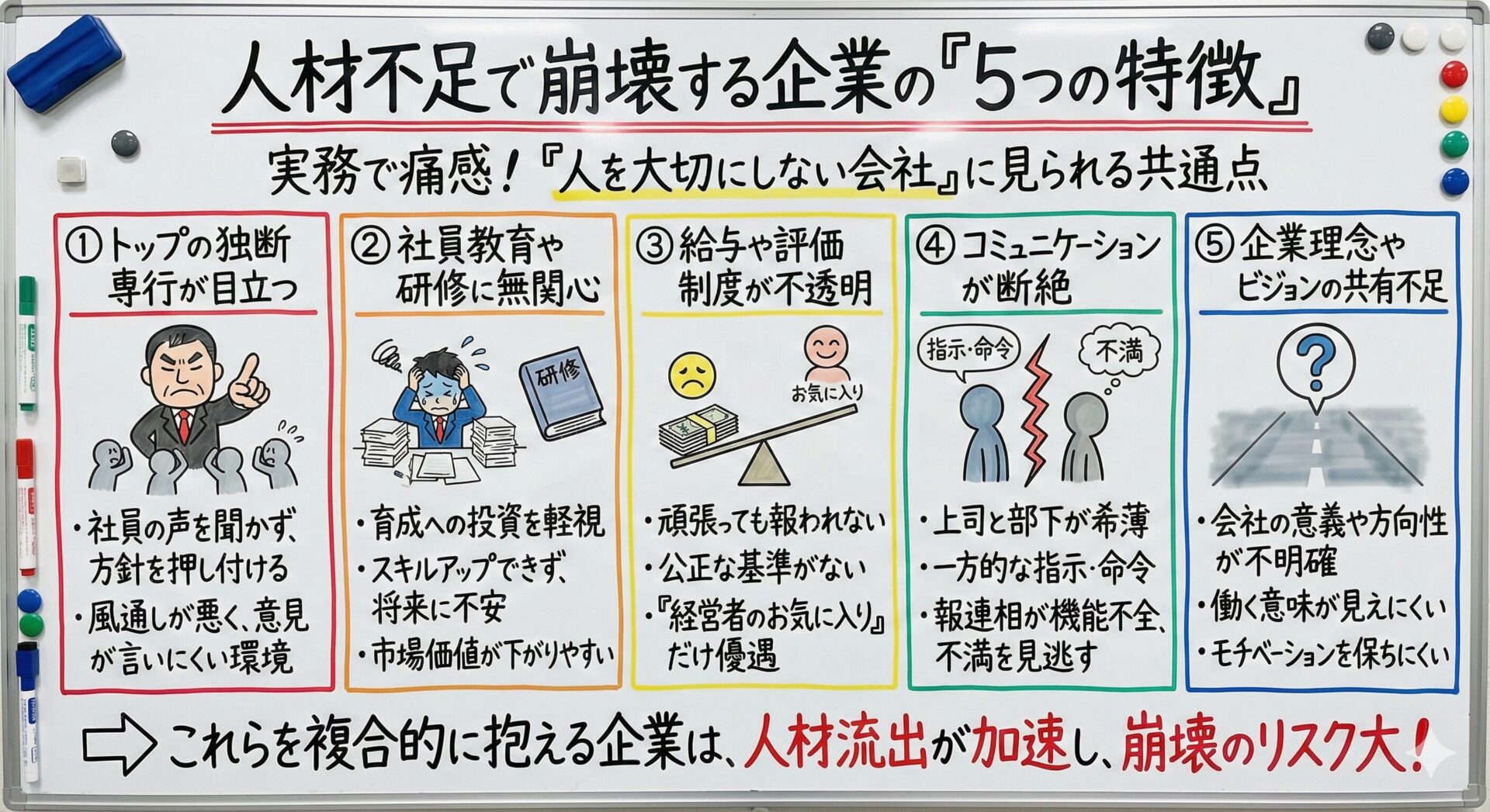 私が実務の中で強く感じるのは、「人を大切にしない会社」には以下の5つの特徴が顕著に表れるケースが多いという点です。