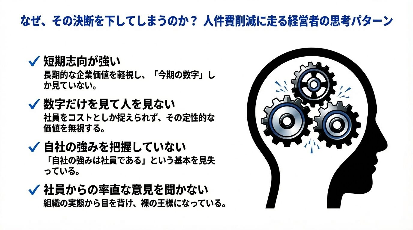 人件費削減を安易に進める経営者には、ある程度共通する思考パターンが見られます。以下に代表的なポイントを挙げます。