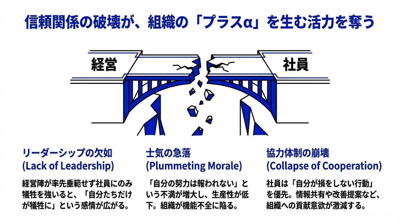 信頼関係が低下すると、社員は「自分が損をしない行動」をとろうとします。その結果、組織の一体感がなくなり、情報共有や改善提案など、会社にとって「プラスα」となる行動が激減します。