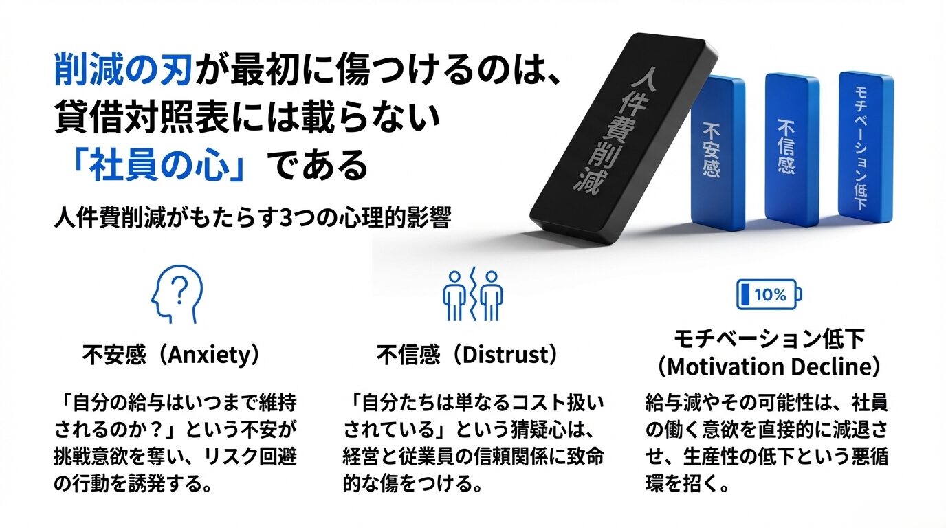 人件費削減が社員の心理面に与える影響は、数字だけでは測れません。「人が辞めないまでも、やる気が失われる」という点に問題が隠れているのです。