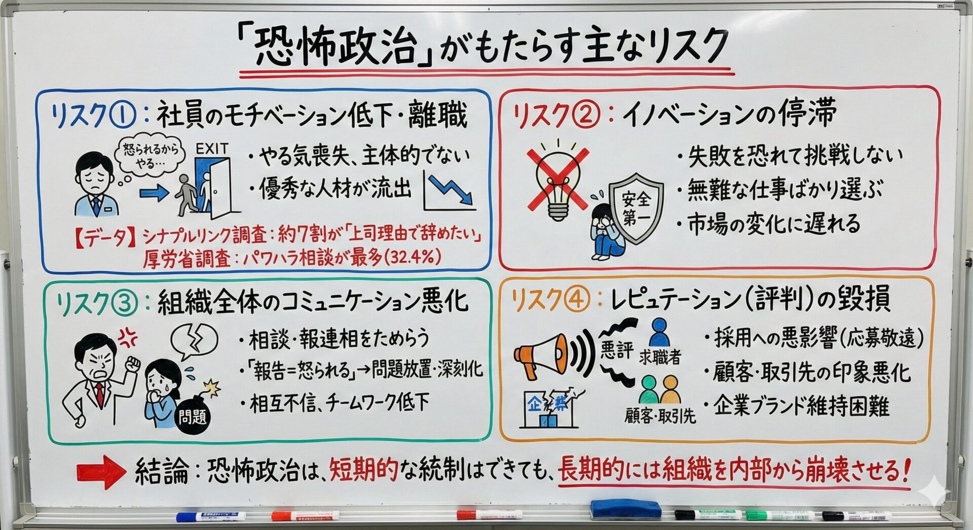 これらの理由から「恐怖政治」に陥る企業は後を絶たないのですが、長期的に見ると、デメリットが大きいことが経験的にもデータ的にも明らかとなっています。
