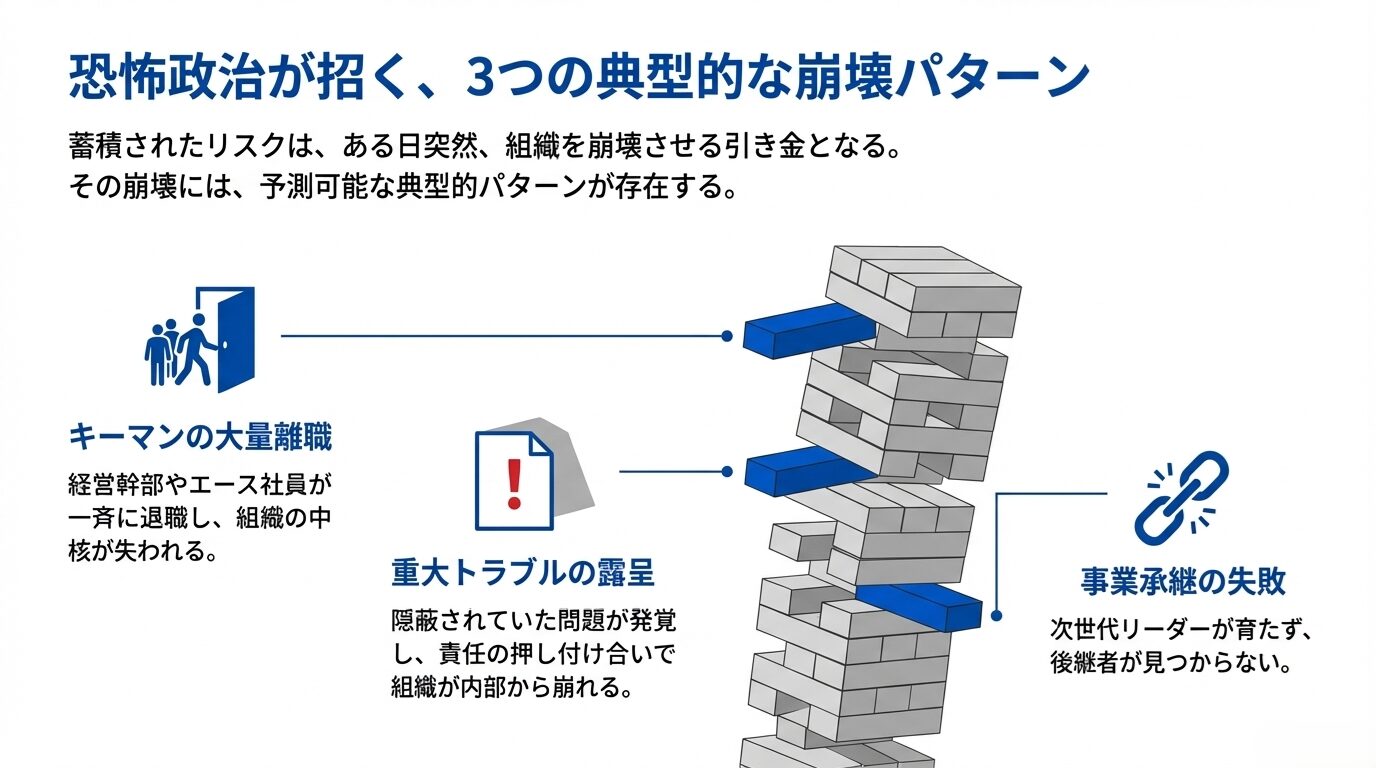 本コラムでは、恐怖を用いる「恐怖政治型のマネジメント」がなぜ危険なのか、そしてどのようなパターンで会社が崩壊していくのかを具体的に解説し、組織の持続的成長を阻害しないためのヒントをお伝えします。将来の人材獲得や事業承継といった大きな課題にも関わる問題ですので、経営者・役員・管理職の方々にはぜひ最後まで読んでいただきたい内容です。
