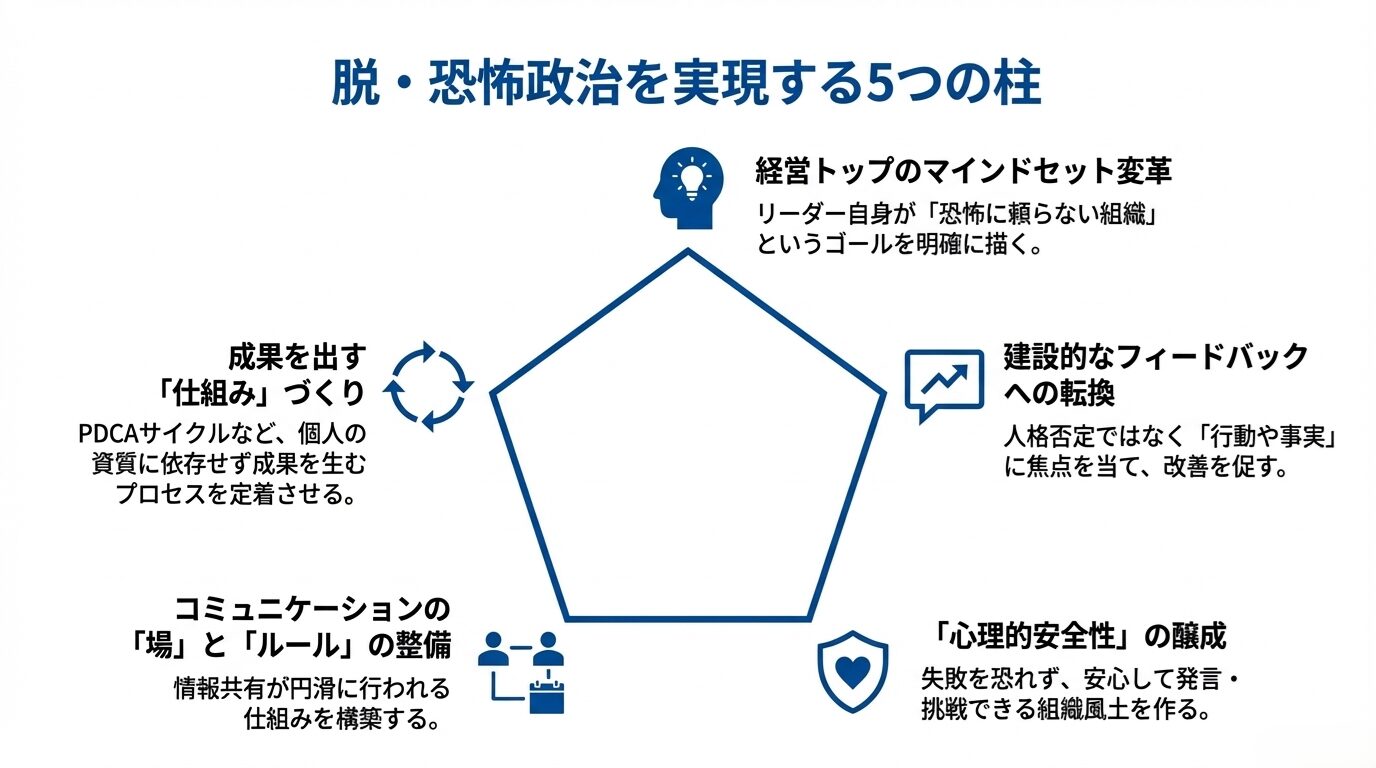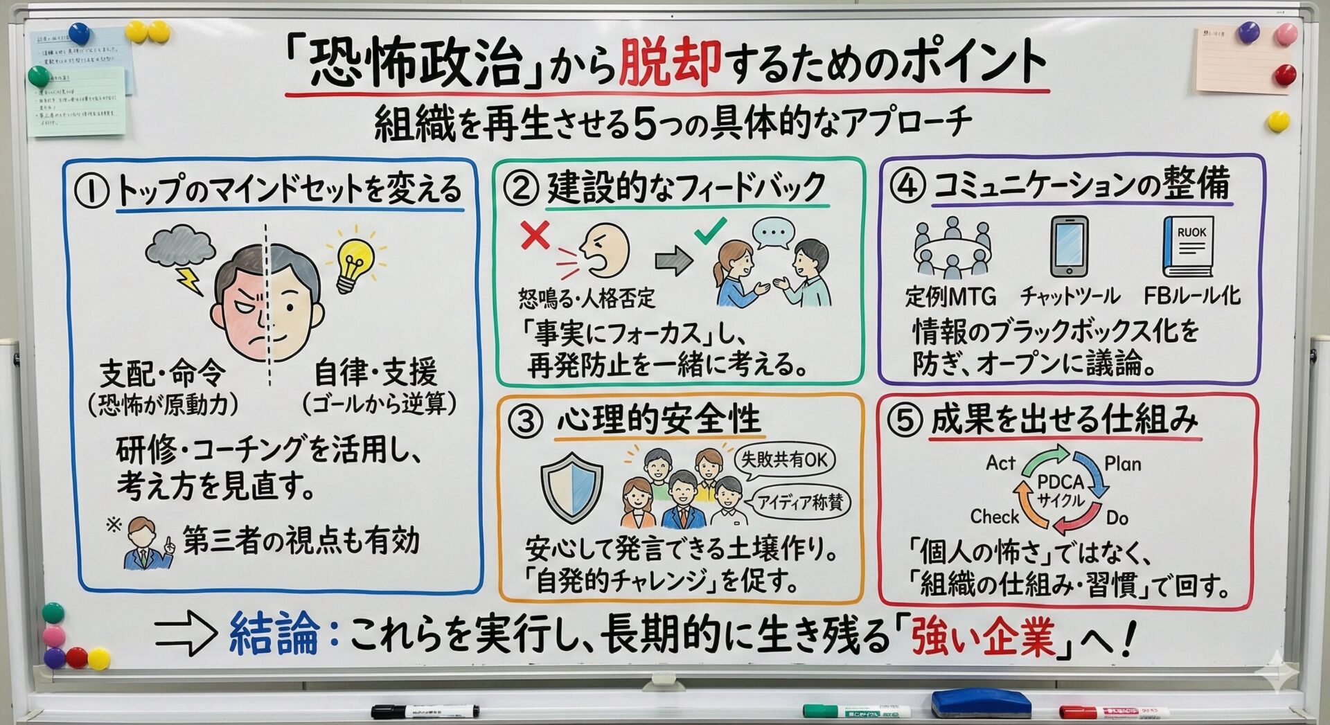 恐怖政治を続けている企業では、最終的な責任者であるトップの考え方が変わらない限り、抜本的な改革は難しいのが現実でしょう。高圧的な方法でしか組織をまとめられないと思い込んでいるリーダー自身が、「自分はどうあるべきか?」を深く見直す必要があります。例えば、「自分が恐怖政治をしなくとも、社員が自律的に動いて成果を上げる組織にしたい」といったゴールを明確に描き、そこから逆算して必要な経営手法を学び直すのです。研修を受けたり、メンターやコーチをつけたりといった方法も有効です。