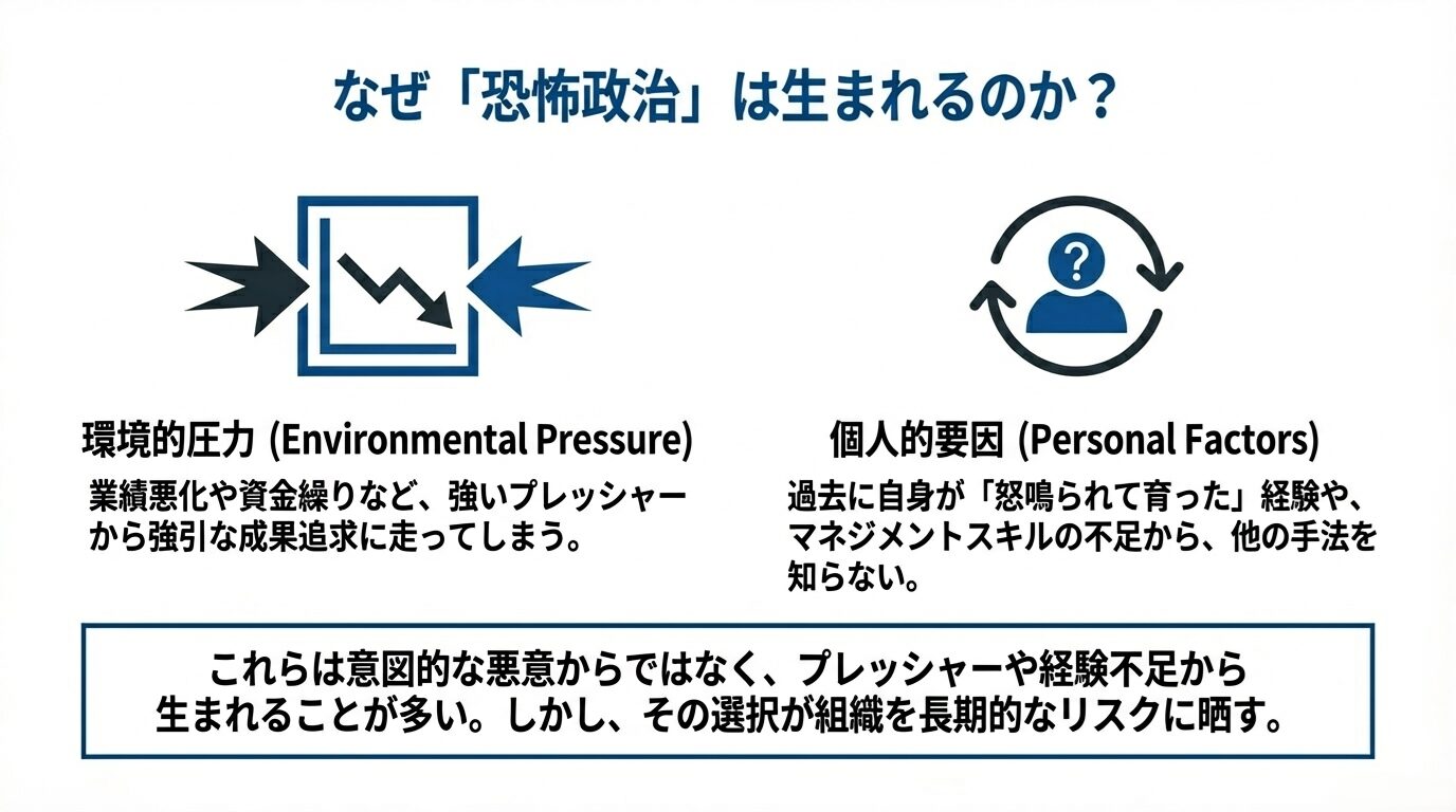 近年のビジネス環境は激しい変化が当たり前となり、組織の柔軟性や社員の主体性がより求められるようになっています。しかし一方で、リーダーが高圧的な姿勢をとり、いわゆる「恐怖政治」によって社員をコントロールしようとする企業は今でも存在します。最初のうちは「成果が出る」「スピードが上がる」などの理由から恐怖による統制が一定の効果を発揮する場面もあるかもしれませんが、長期的には大きなリスクをはらんでいます。