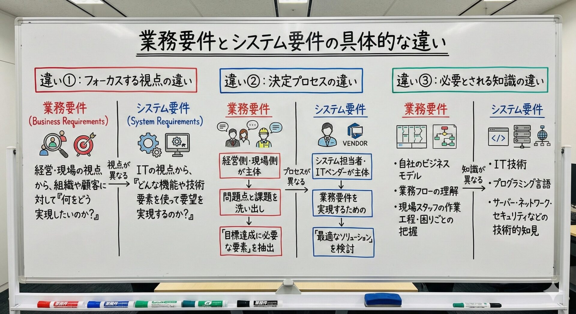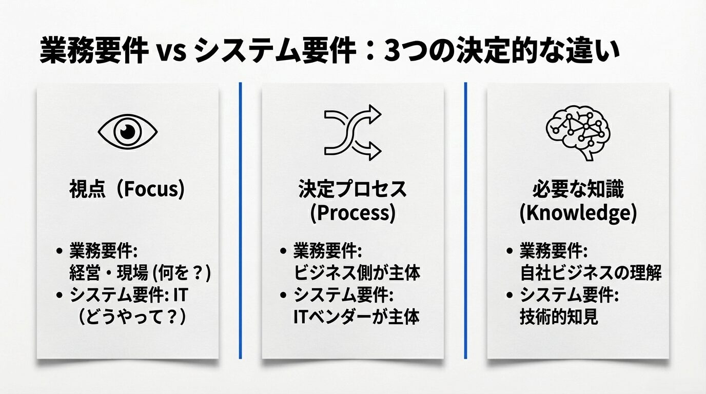 業務要件とシステム要件の主な違いは、次の3点となります。