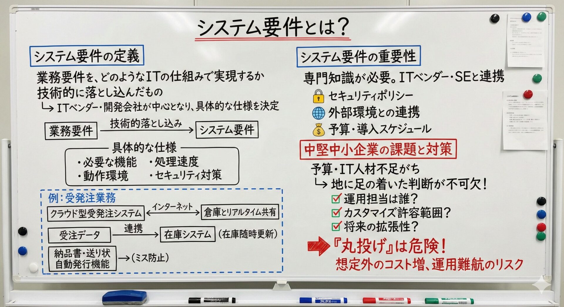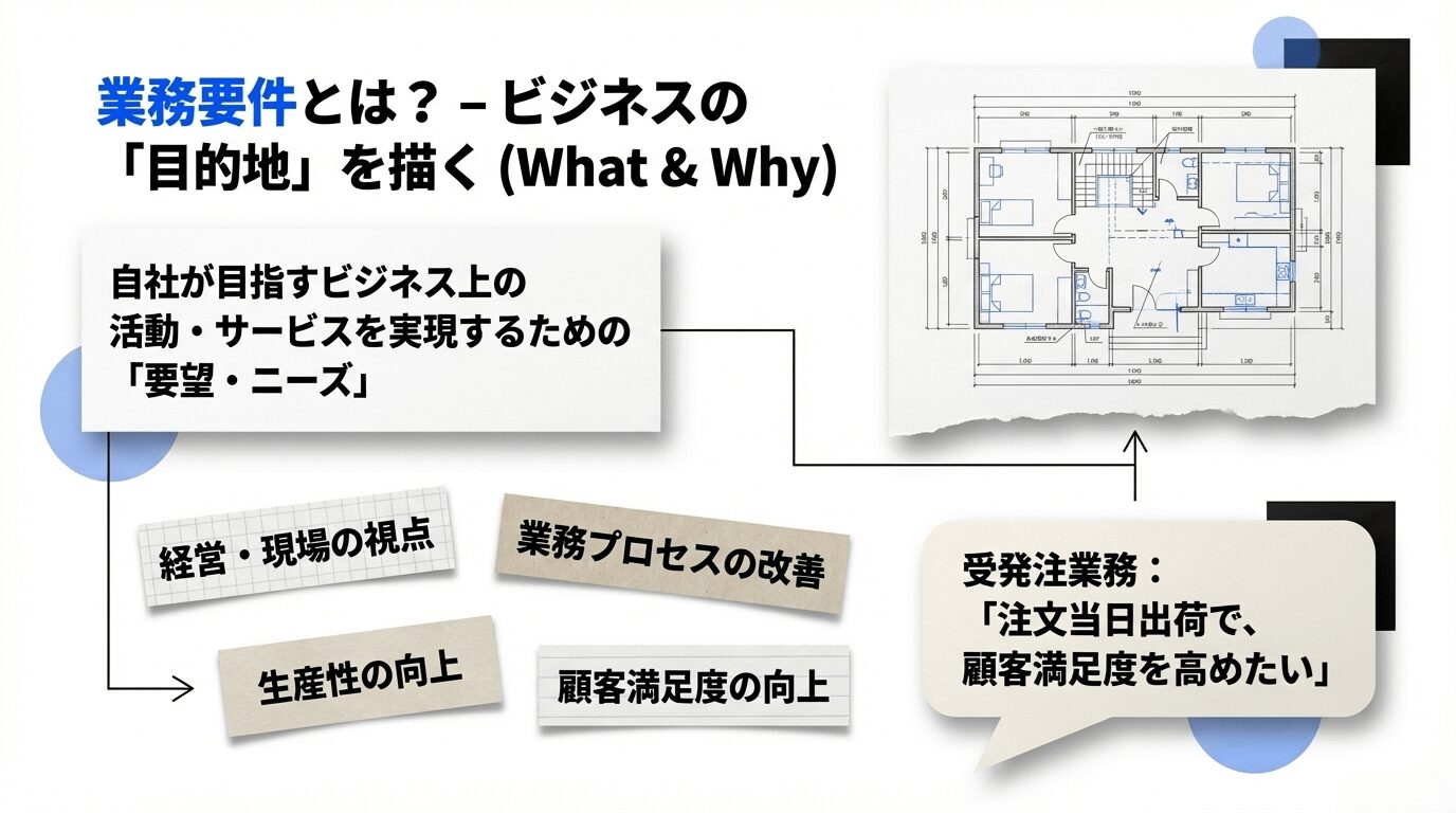 この4ステップを経て、ようやく「何を実現したいのか」という業務要件の全体像が見えてきます。こうした整理こそが、次に挙げる「システム要件」を正確に導く土台となるわけです。