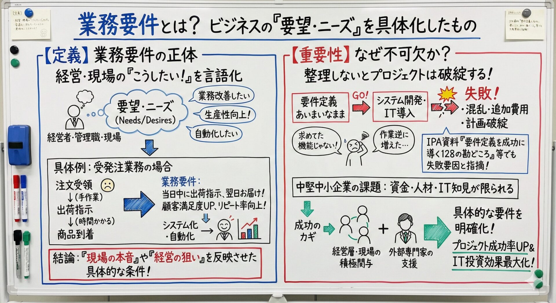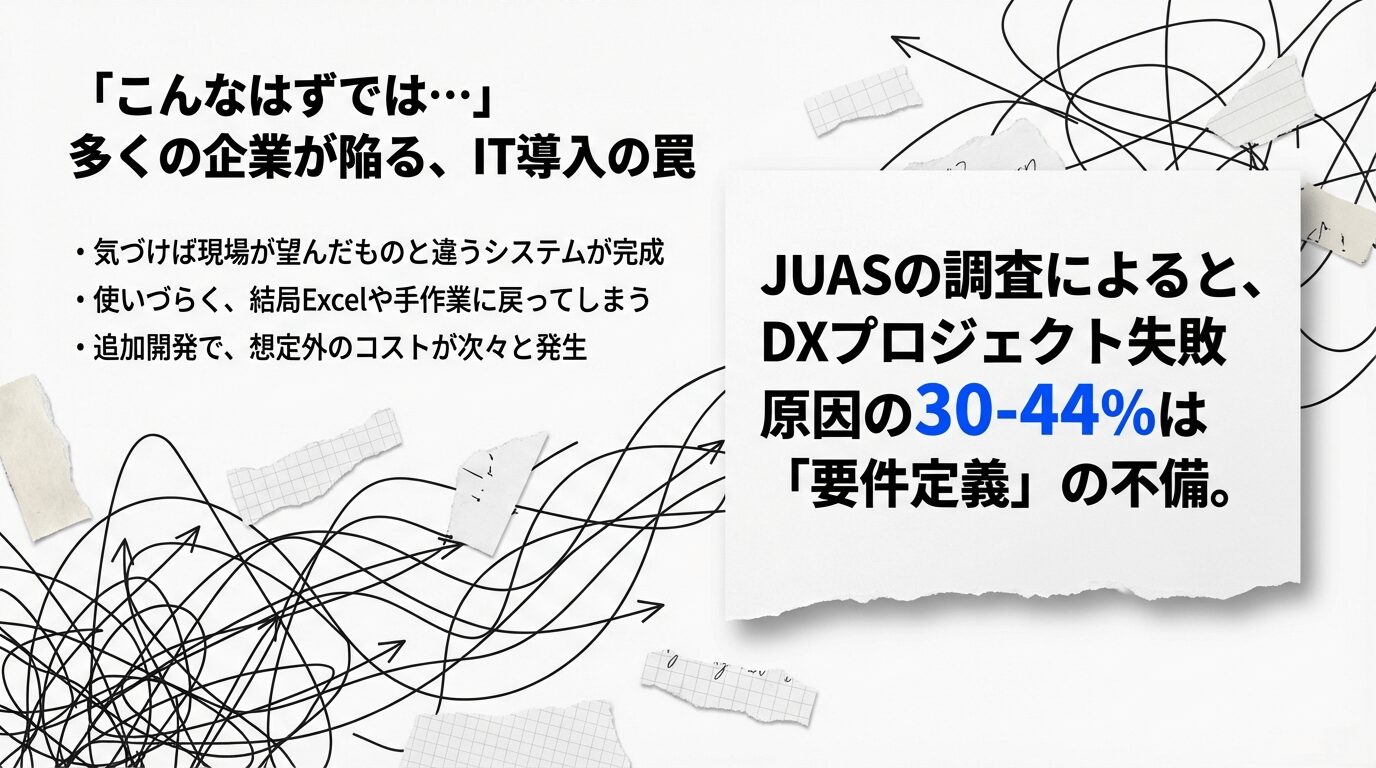 業務要件をきちんと整理せずにシステム開発やIT導入に着手してしまうと、後々「求めていた機能はこれではない」「この工程で自動化が止まってしまい、かえって作業が増えた」など、現場の混乱や追加費用が発生しがちです。特に中堅中小企業では、限られた資金・人材でプロジェクトを進めるケースが大半であるため、プロジェクトの途中で要件漏れが判明して大きな修正が必要になると、そのまま計画そのものが破綻してしまう可能性もあります。独立行政法人情報処理推進機構(IPA)が発行した『要件定義を成功に導く128の勘どころ』では、要件定義の不備がシステム開発プロジェクトの失敗要因として挙げられています。​この資料では、要件定義の重要性が強調されており、特にユーザー企業側の活動の遅れや要件の不明確さが問題視されています。 ​