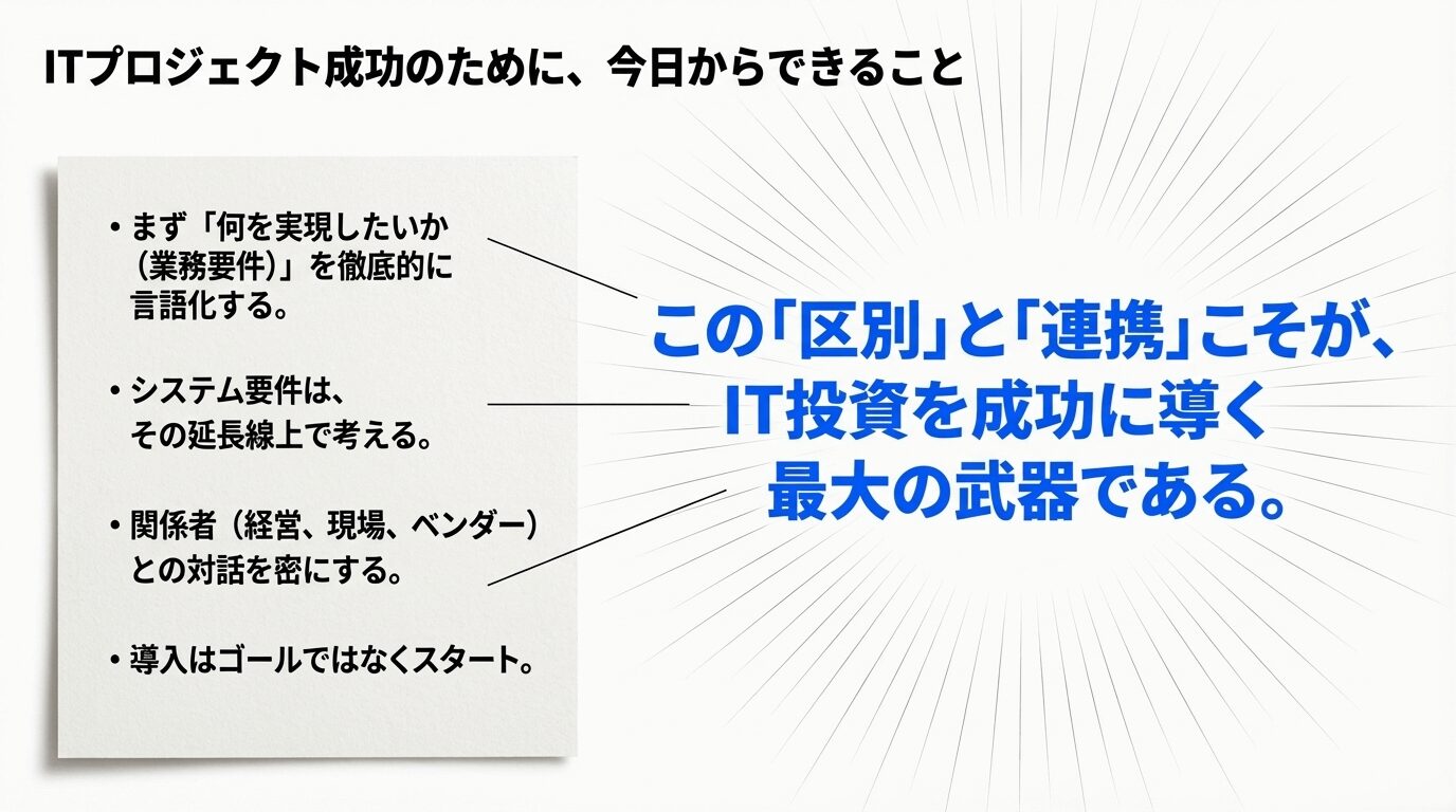 ここまで、業務要件とシステム要件の違い、そしてその要点や注意すべきポイントを整理してきました。中堅中小企業がITプロジェクトを成功させるうえで、最も大切なのは以下の点です。