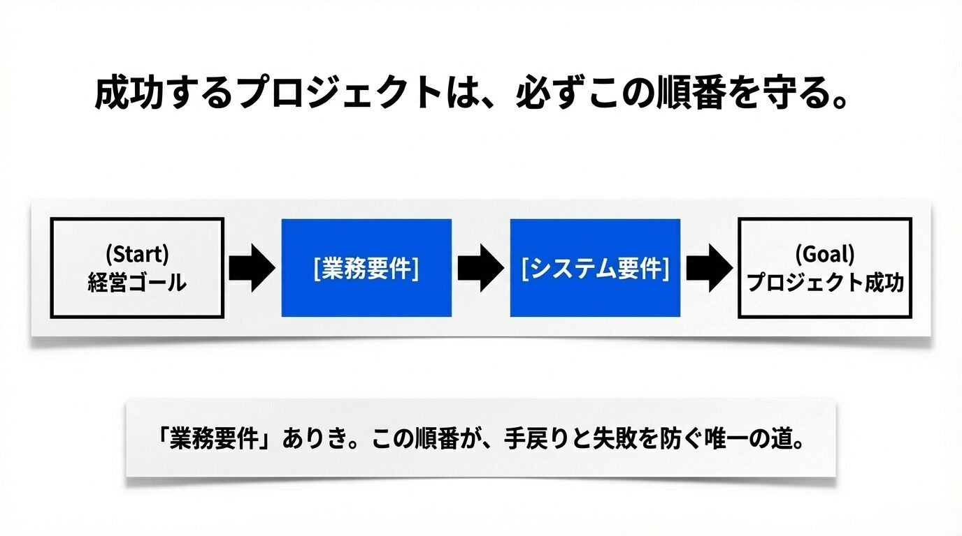 A: 企業の業種や規模、組織文化によって最適解は変わります。ただし、共通するポイントは「まずは業務要件ありきで考え、システム要件はその後に決める」という検討順序です。業務要件が曖昧なままシステム要件を先に固めてしまうと、後になって手戻りが多発するリスクが高まります。