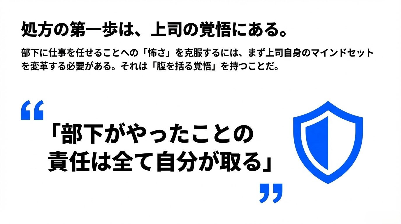 A:上司が部下に仕事を任せることが難しいと感じる主な理由は、自分がコントロールできない結果への「怖さ」にあります。この克服方法としては、「部下がやったことの責任はすべて自分が引き受ける」と腹を括る覚悟を持つことが重要です。この覚悟を明確に持つことで、上司は安心して部下に裁量を与えられるようになります。