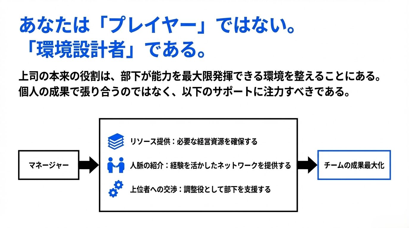 A:上司は個人の成果で部下と競うのではなく、組織全体の成果を最大化することに集中すべきです。上司の役割は、部下が最大限の能力を発揮できるよう環境を整えることです。上司が組織全体の成果向上に貢献する役割をしっかり果たしていれば、個々の数字は気にならなくなります。