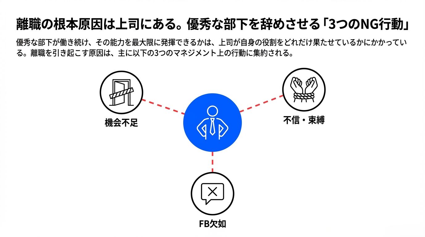 A:優秀な社員が退職する主な理由は、上司との関係に起因することが多く、特に以下の3つの行動が原因となります。