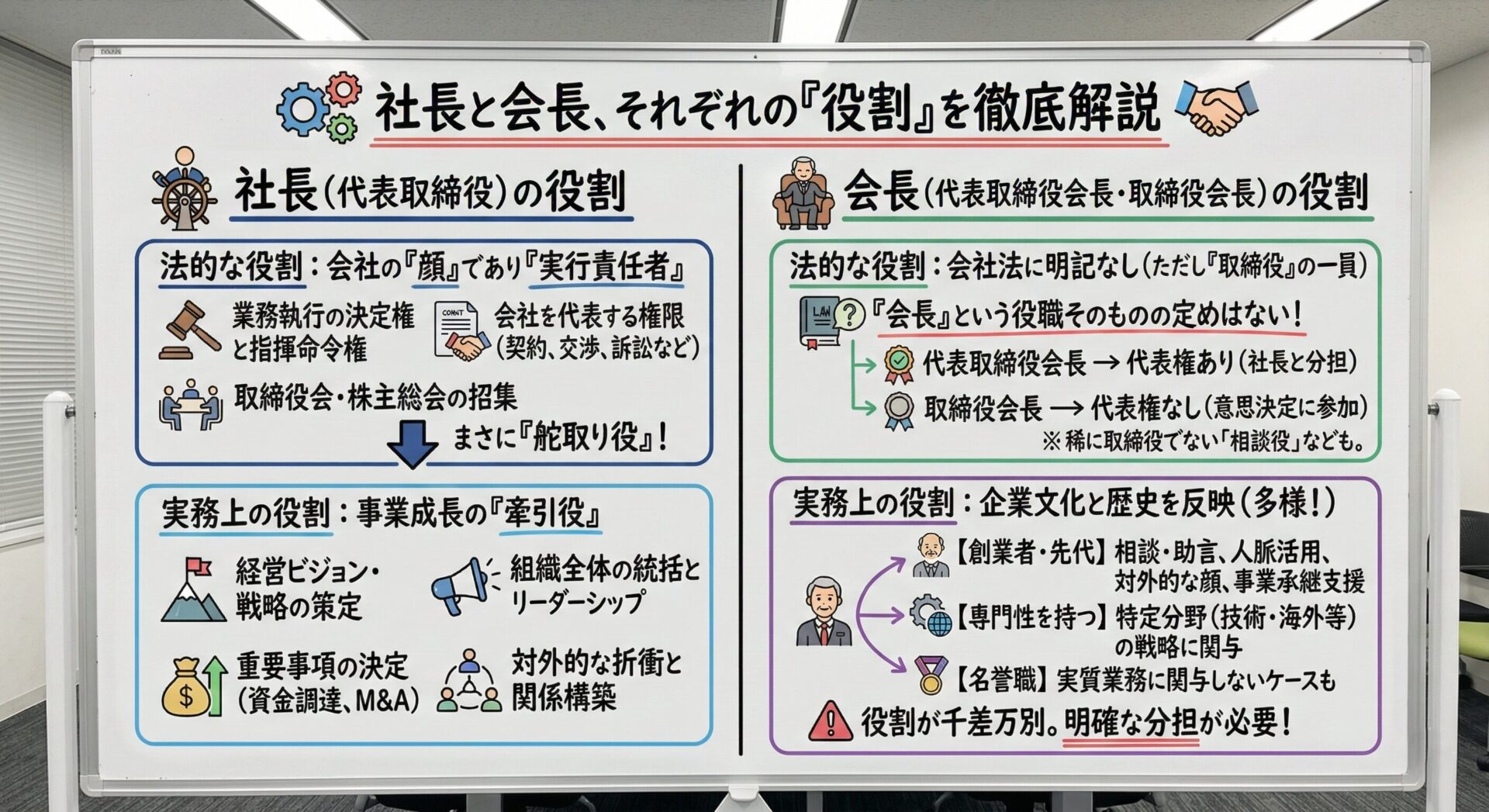 社長と会長という役職は、単なる肩書きではありません。それぞれが会社の重要な役割を担い、企業の成長と安定に貢献する「両輪」であるべきです。