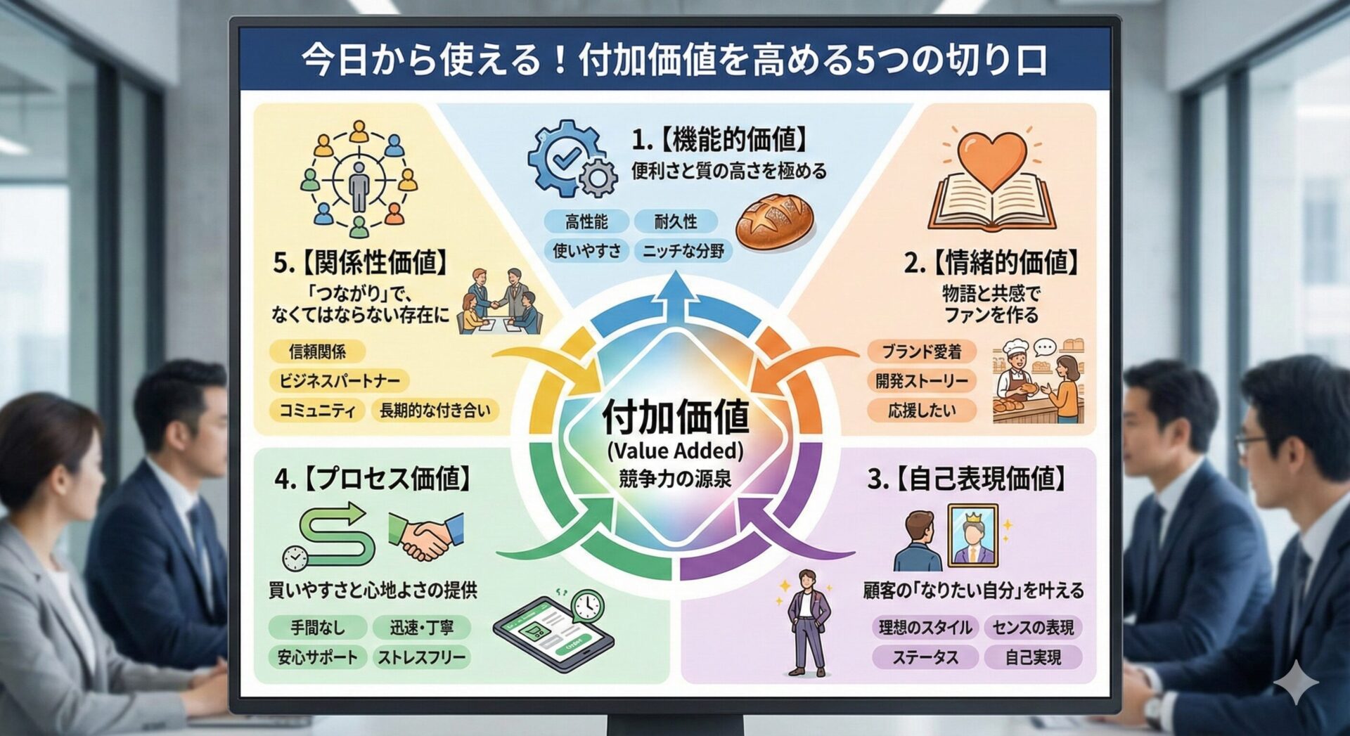 本日は、中堅中小企業が厳しい競争を勝ち抜くための鍵である「付加価値」について、その本質から、具体的な5つの向上策までを解説してきました。