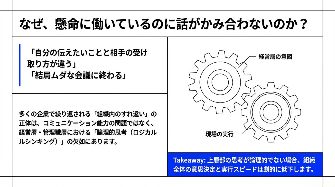 私も多くの企業の経営支援をしてきましたが、組織内でのすれ違いや誤解が繰り返される場合の原因の一つとして、「論理的思考の欠如」が挙げられます。特に経営者・役員・管理職クラスが論理的思考を苦手としていると、組織全体の意思決定やコミュニケーションが混乱に陥りやすくなります。