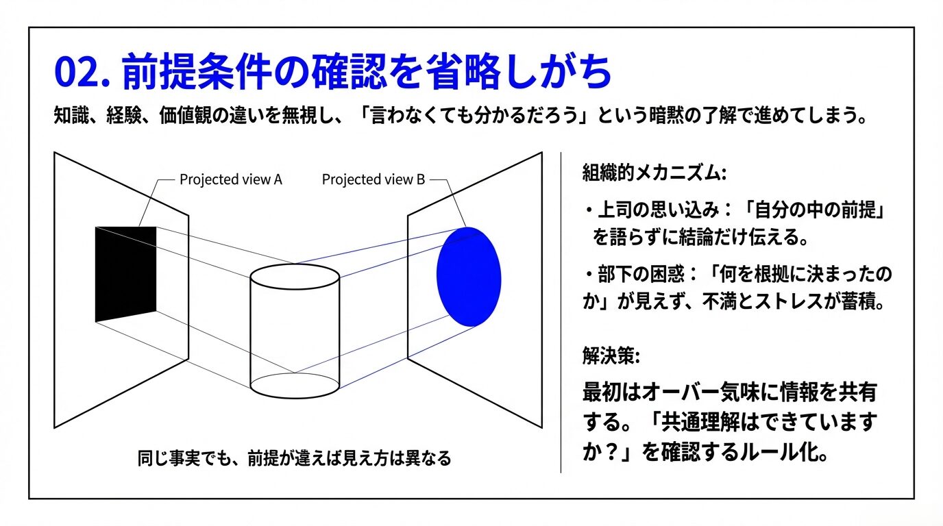 前提条件の確認ができない原因としては、「時間的余裕のなさ」「専門知識を持つ人との情報格差」「当たり前だと思いこんでいる認識不足」などが挙げられます。とりわけ日本企業では、「言葉にしなくても分かるだろう」という暗黙の了解がコミュニケーションの阻害要因となる場合があります。