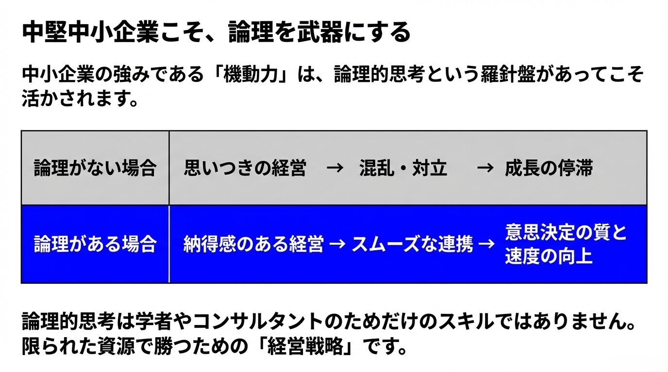 中堅中小企業では、「とりあえず動いてみよう」「小回りがきくから」といったプラスの面を活かしながら経営を行うのが理想です。しかし、論理的思考が欠如していると、せっかくの機動力が空回りするばかりか、社内に混乱や対立を生み出し、長期的な成長を妨げます。