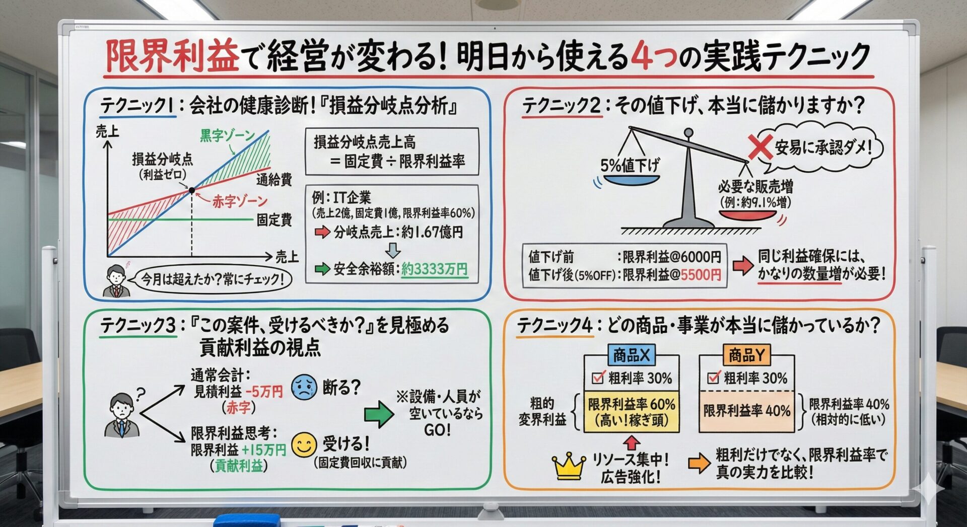 固変分解を行い、自社の限界利益が計算できるようになったら、いよいよ実践です。ここでは、私がクライアントに必ずアドバイスする、限界利益を活用した4つの経営判断テクニックをご紹介します。