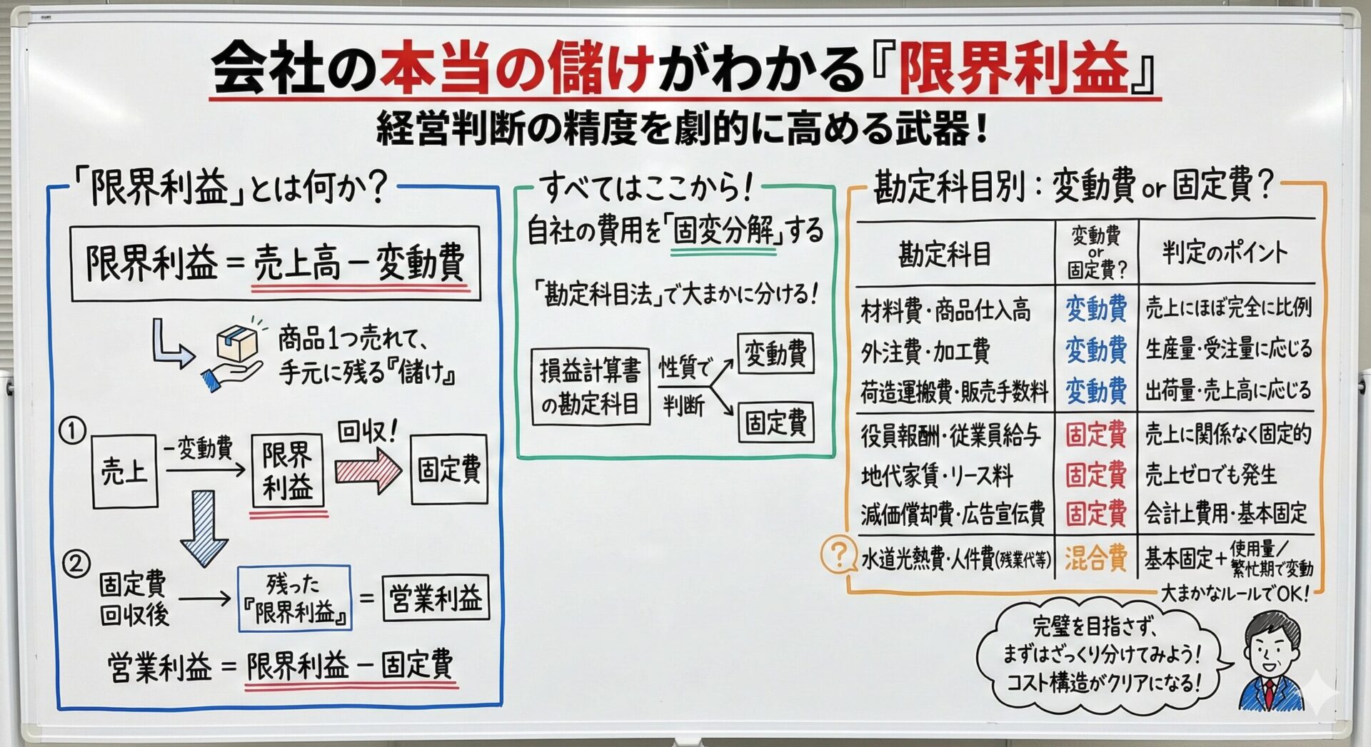 - 「限界利益(売上高-変動費)」こそが、売上の増加によって手元に残る儲けを示す。