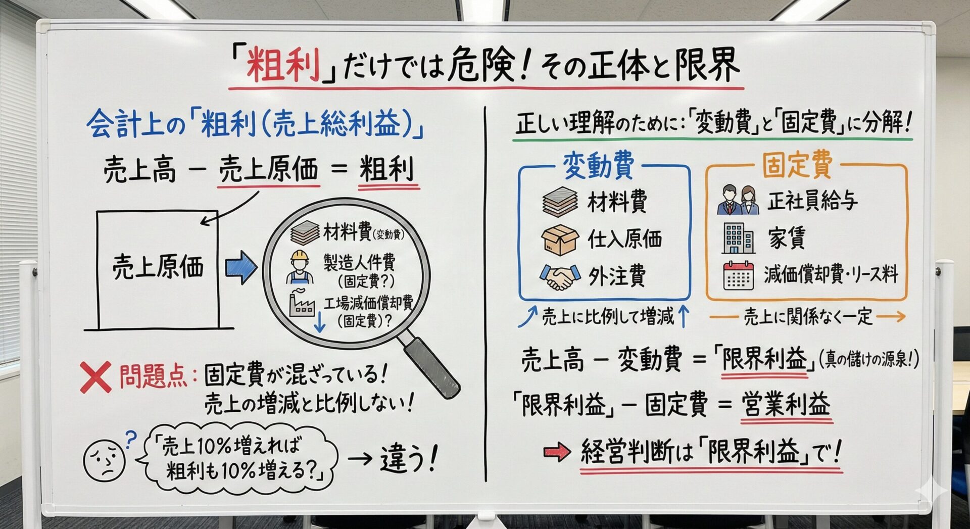 今回は、「粗利」と「限界利益」の決定的な違い、そして限界利益を活用した実践的な経営判断の方法について、私の経験を交えながら解説しました。