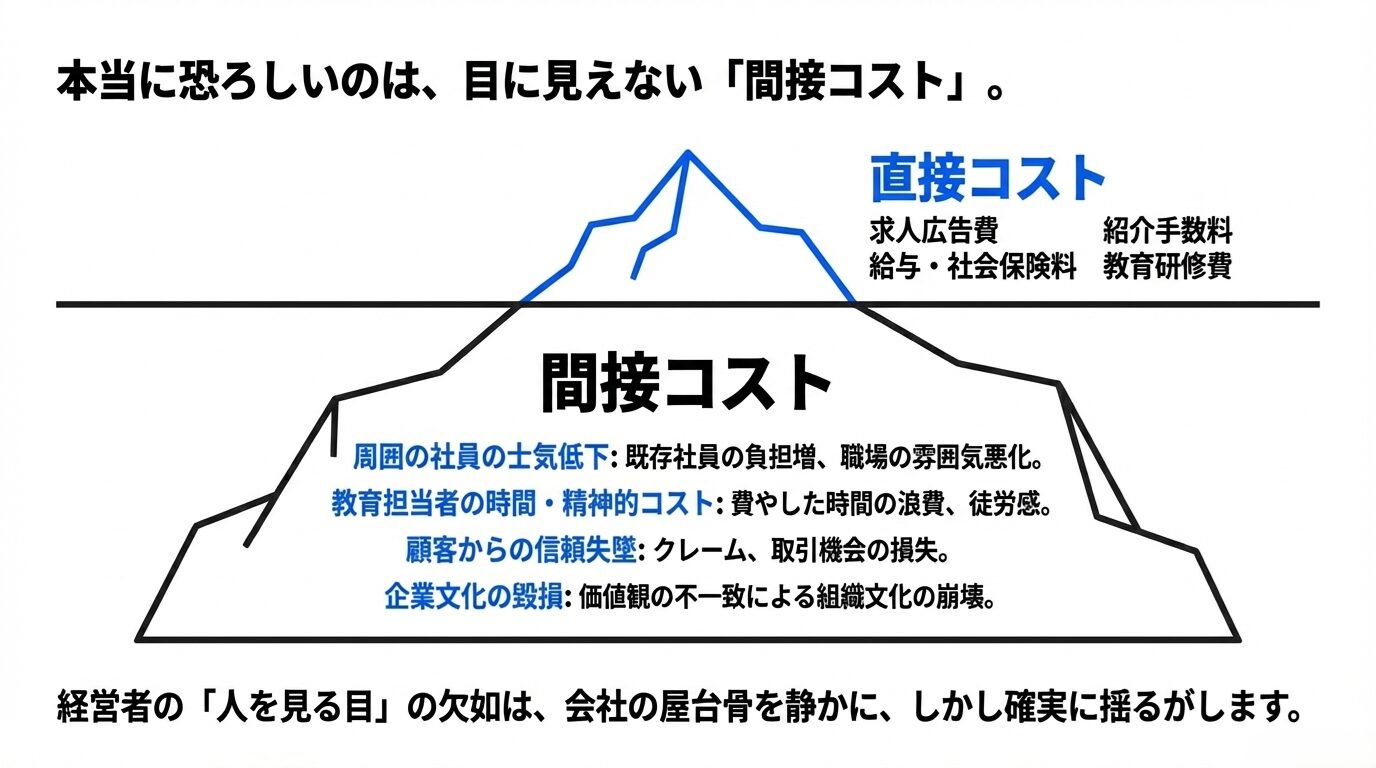 これらの間接コストは金額に換算しづらいものですが、会社の成長を確実に蝕んでいきます。経営者の「人を見る目」の欠如は、会社の屋台骨を静かに、しかし確実に揺るがすのです。