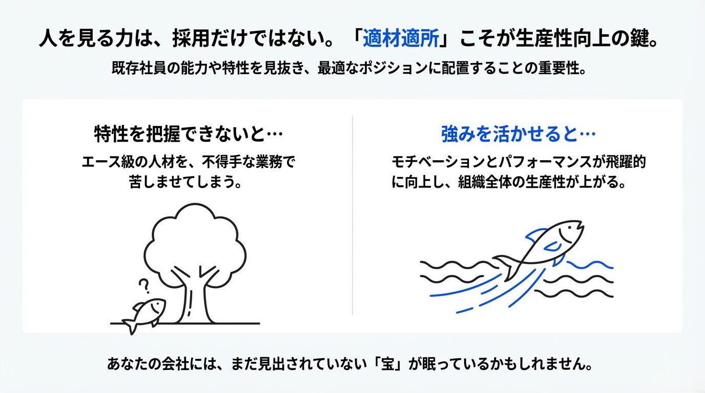 人を見る力は、採用時だけに求められるものではありません。むしろ既存社員の能力や特性を見抜き、最適なポジションに配置する「適材適所」の実現においてこそ、その真価が問われます。