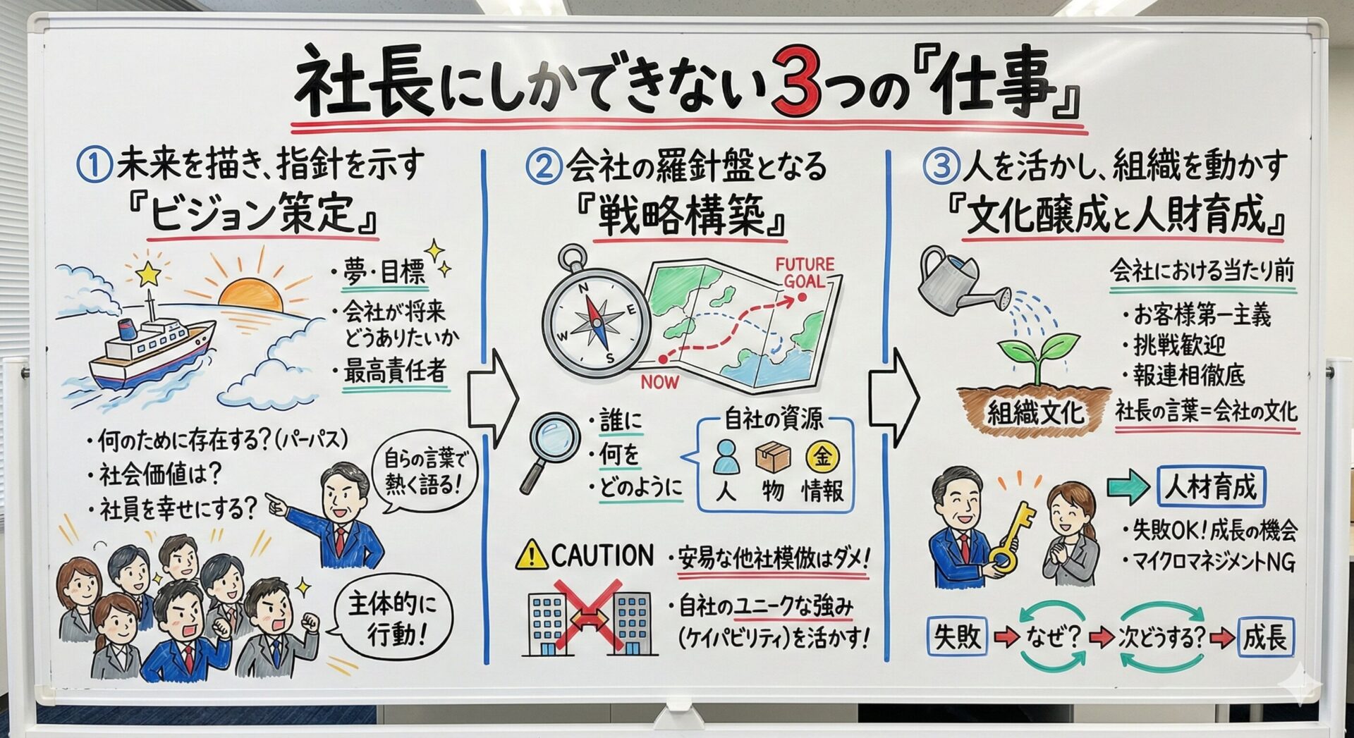 では、社長にしかできない仕事とは、具体的に何でしょうか?私は長年の経験から、それは以下の3つに集約されると考えています。