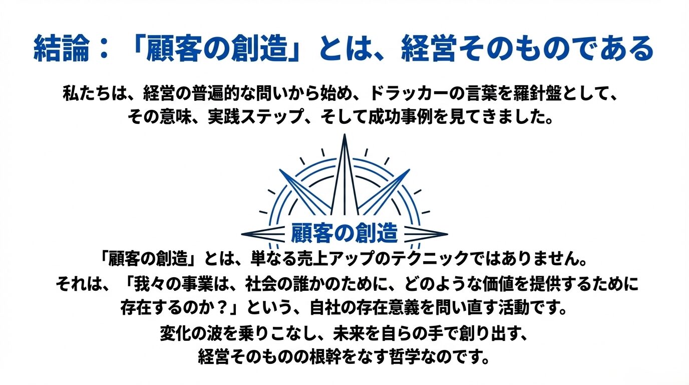 本コラムでは、ドラッカーの「顧客の創造」という言葉を道標に、現代の経営における本質と、その実践的なステップについて解説してきました。