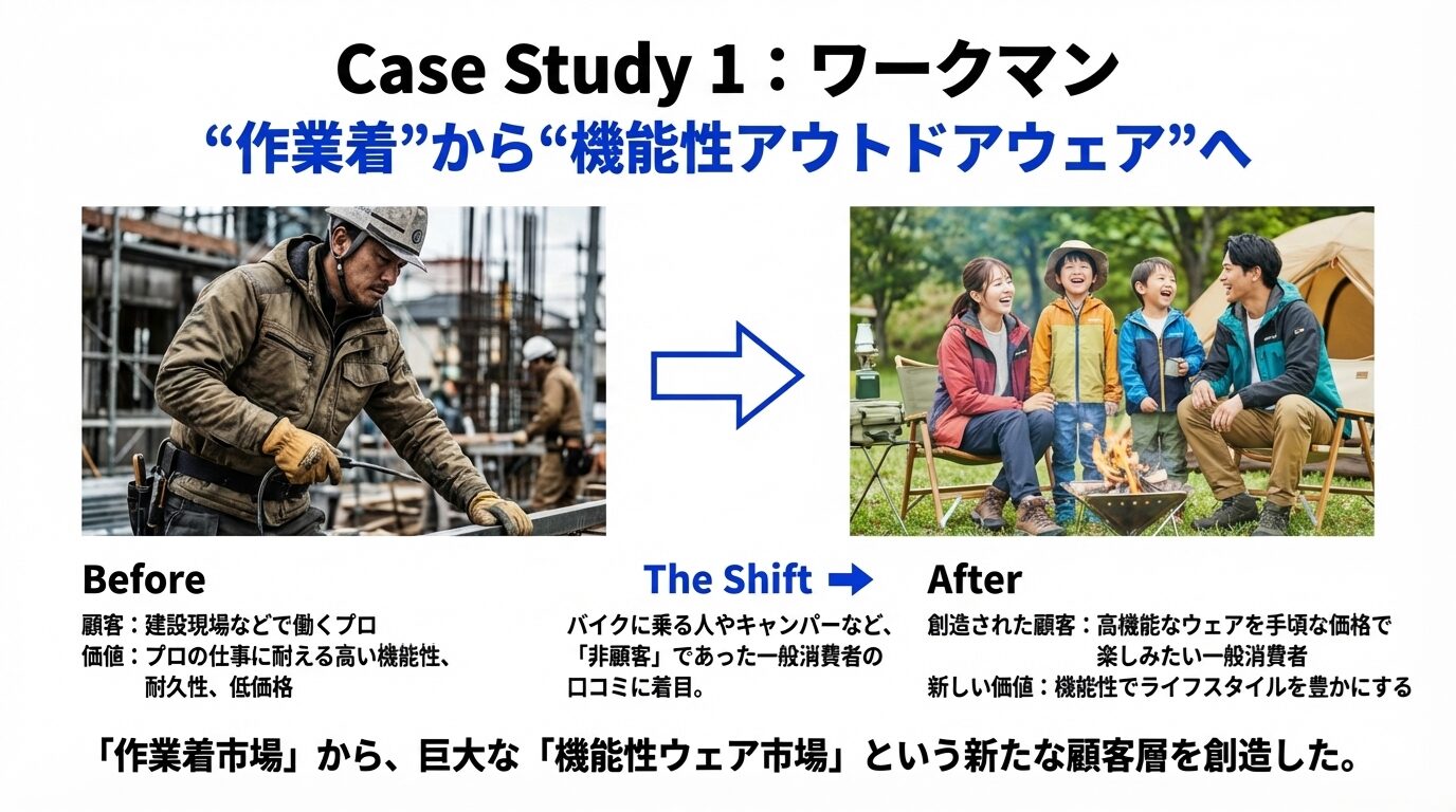 言わずと知れた成功事例ですが、まさに「顧客の創造」の教科書です。ワークマンは元々、建設現場などで働くプロ向けの作業着専門店でした。彼らが提供していた価値は「プロの仕事に耐える、高い機能性と耐久性、そして低価格」です。しかし、ある時点から、その機能性の高さが、バイクに乗るライダーや、釣り、キャンプといったアウトドアを楽しむ一般の人々の間で口コミで広がり始めました。