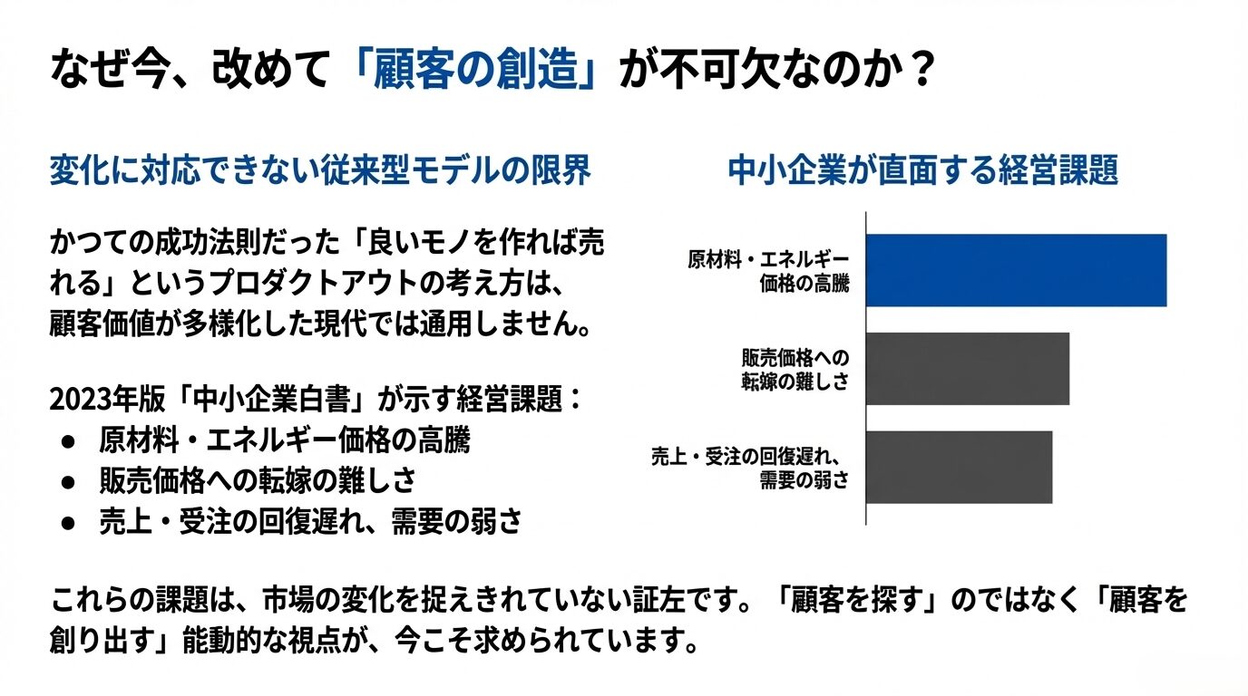 実際に、中小企業庁が公表している「2023年版 中小企業白書・小規模企業白書」によれば、多くの中小企業は「原材料・エネルギー価格の高騰」への対応やそれを「販売価格に十分に転嫁できない難しさ」、さらに「売上・受注の回復の遅れや需要の弱さ」を経営上の課題として挙げています。これらの実態は、従来型のビジネス手法や価格決定の仕組みだけでは、顧客ニーズや市場環境の変化を十分に捉えきれなくなっていることの証左といえるでしょう。このような時代だからこそ、「顧客はどこにいるだろうか?」と探すのではなく、「どうすれば、我々の価値を必要とする顧客を創り出せるか?」という能動的な視点、すなわち「顧客の創造」が不可欠なのです。