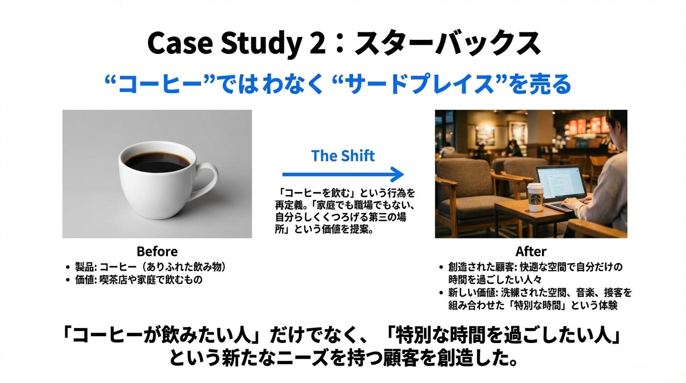 スターバックスが登場するまで、多くの人々にとってコーヒーは、喫茶店で飲むか、家で淹れるか、あるいはオフィスで飲む、ありふれた飲み物でした。しかし、スターバックスはコーヒーそのものではなく、「家庭(ファーストプレイス)でも、職場(セカンドプレイス)でもない、自分らしくくつろげる第三の場所(サードプレイス)」という新しい価値を提案しました。