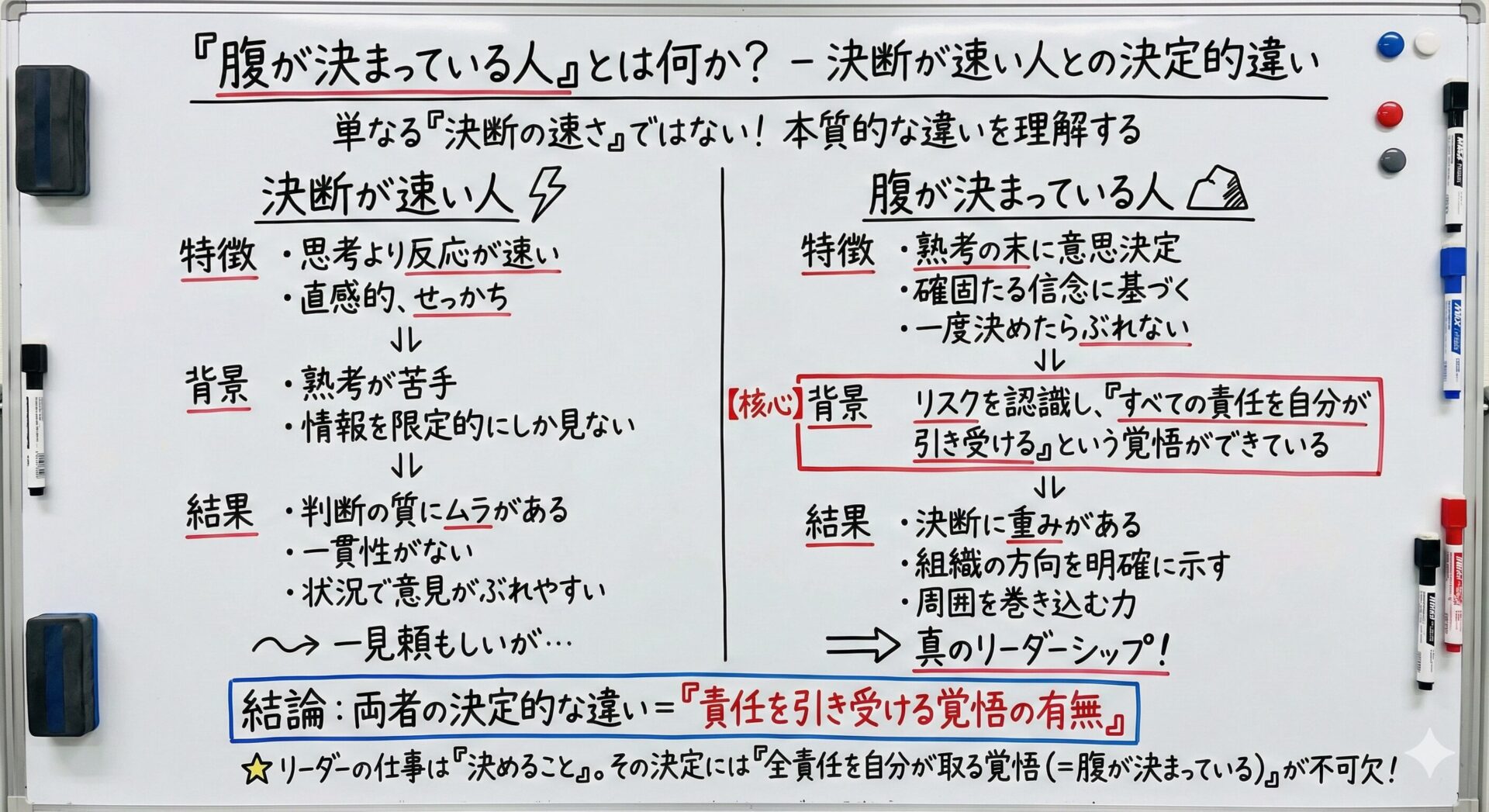 - 「腹が決まっている」とは、単に決断が速いのではなく、「責任を引き受ける覚悟」がある状態。