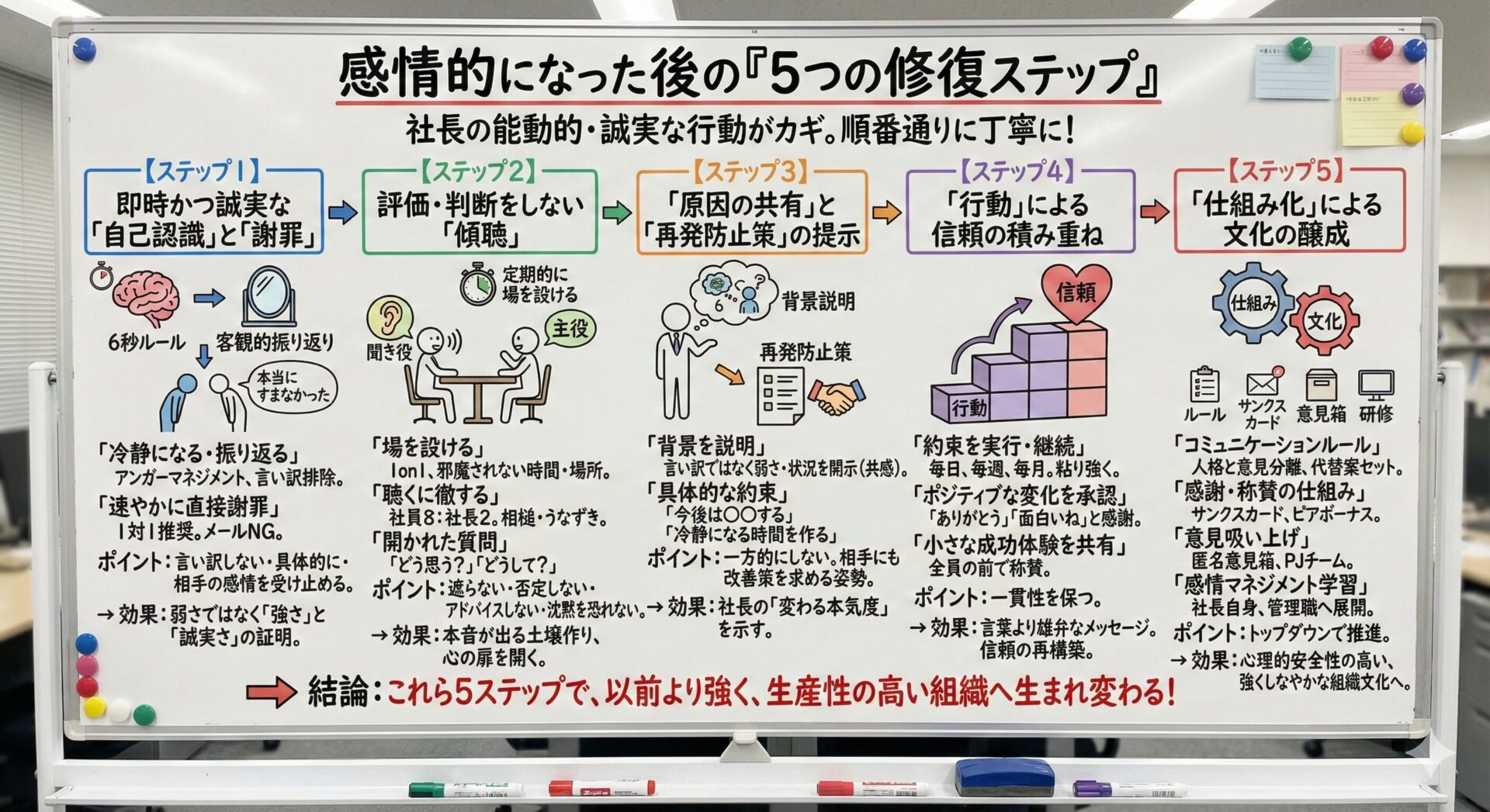 - 信頼関係の修復には、「謝罪」「傾聴」「原因共有」「行動」「仕組み化」という5つの具体的なステップを、誠実に、そして粘り強く実行することが不可欠であること。