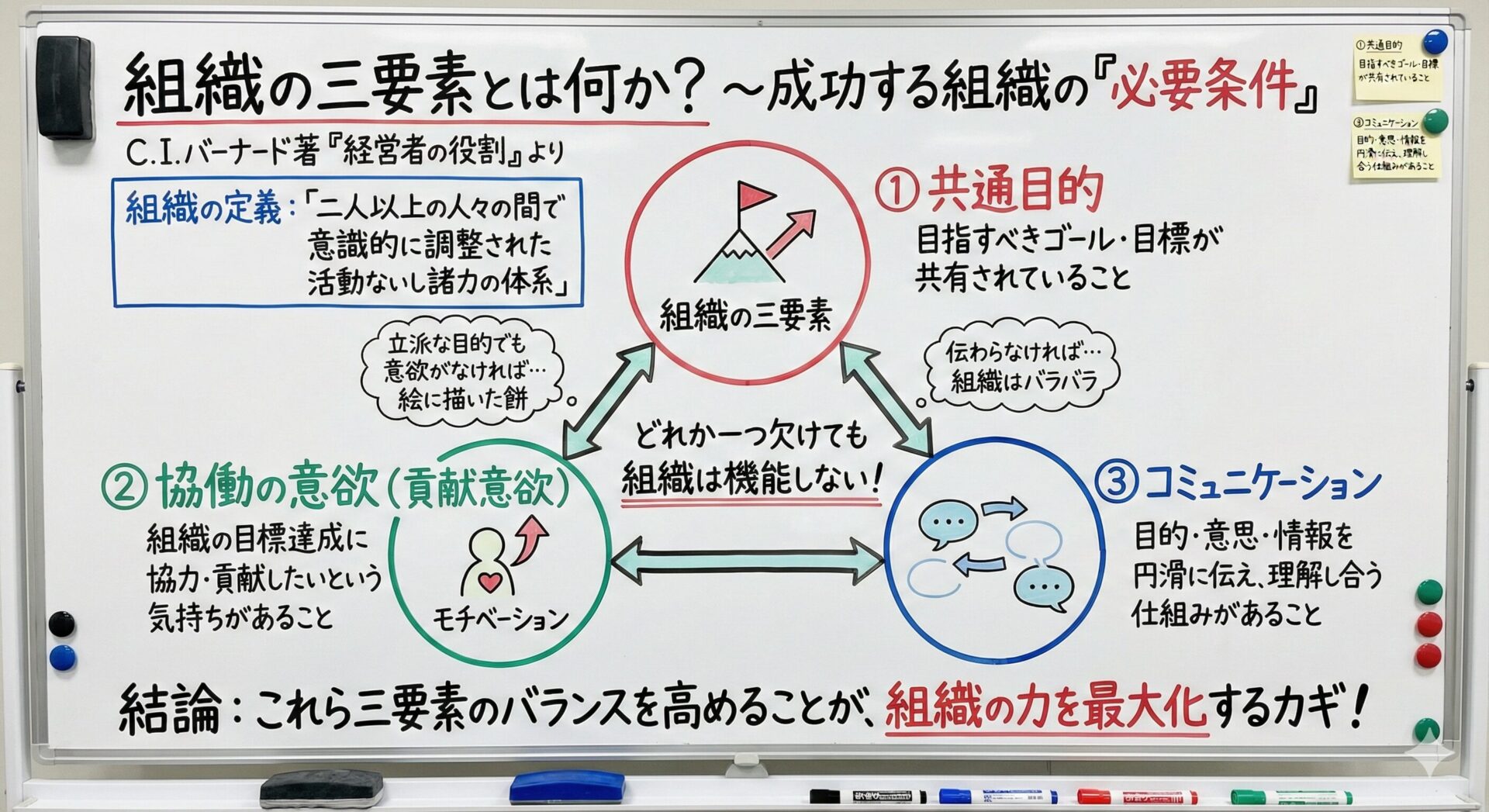著書『経営者の役割』の中で、バーナードは組織を「二人以上の人々の間で意識的に調整された活動ないし諸力の体系」と定義し、組織が組織として成立し、存続していくために、以下の三つの要素が不可欠であると説きました。