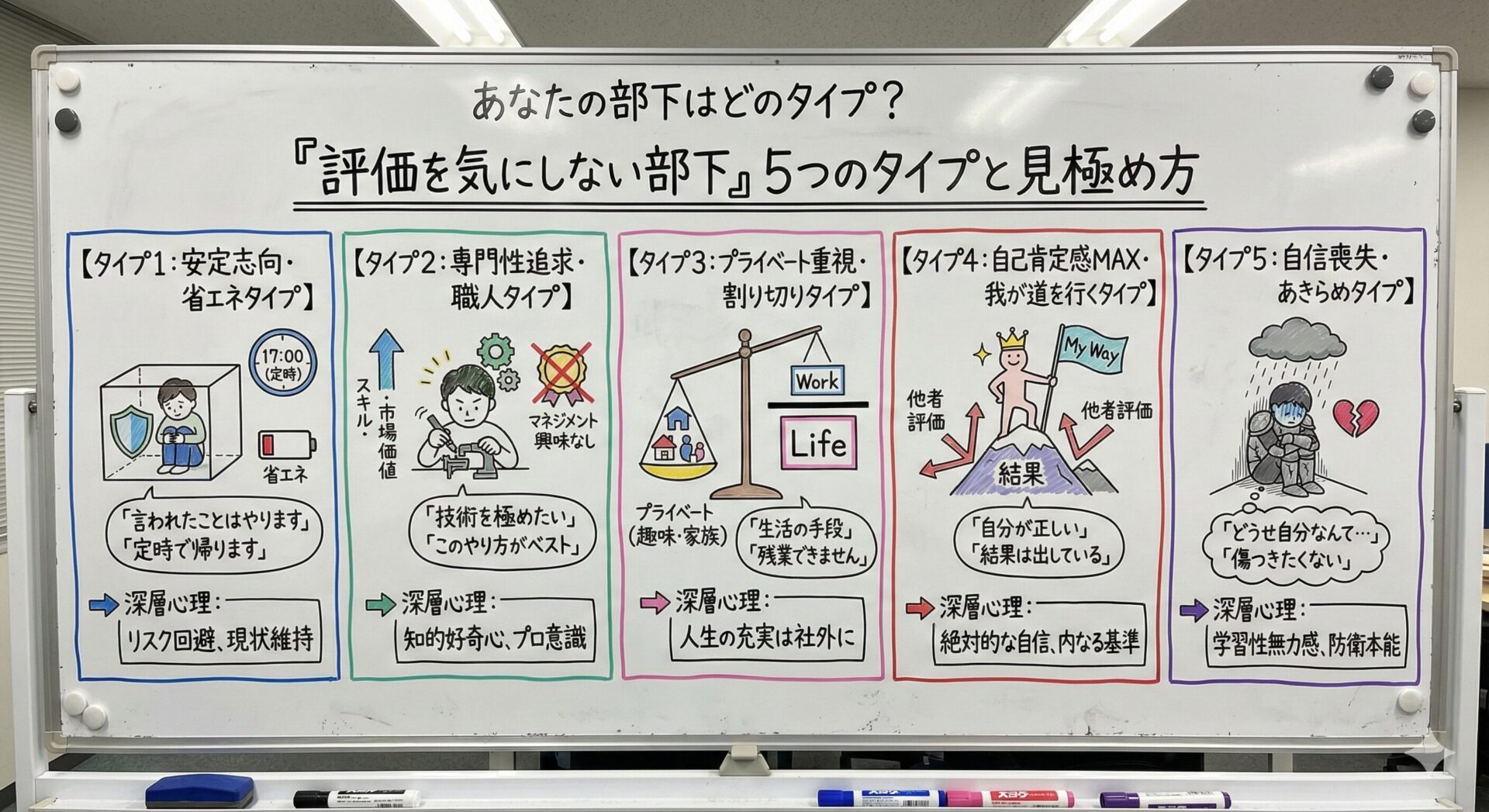 とはいえ、「部下は評価を気にしない」と一括りにしてはいけません。その背景にある思考は一人ひとり異なります。ここでは、私が現場で見てきた経験から代表的な5つのタイプに分類し、その見極め方を解説します。