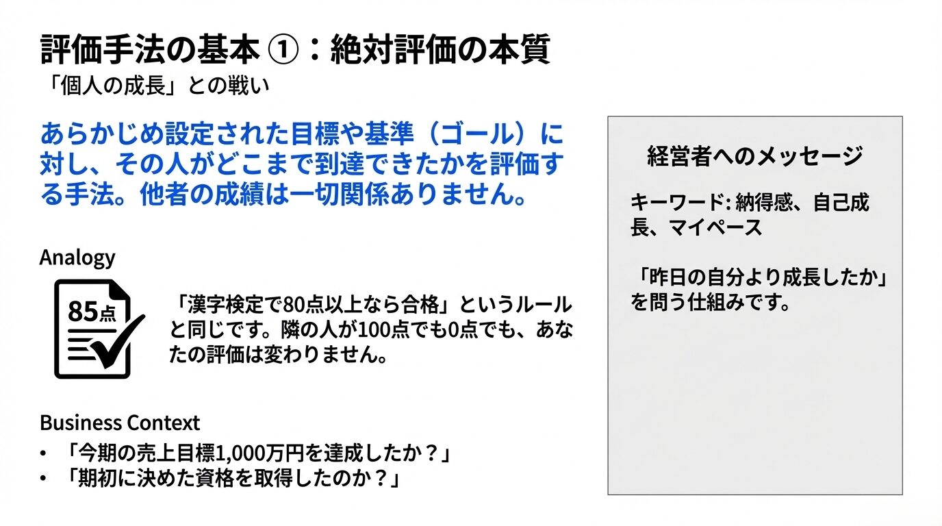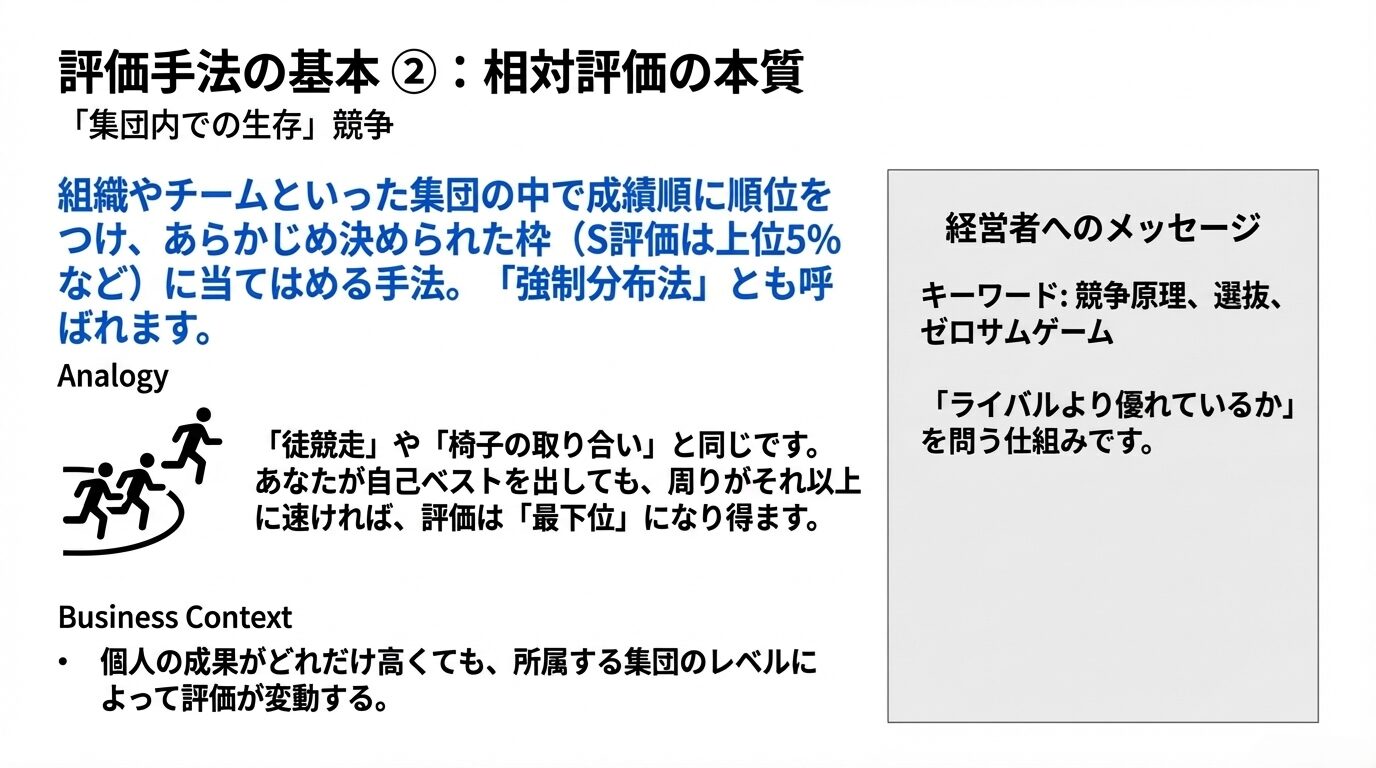 まずは、「絶対評価」と「相対評価」という二つの評価手法が、本質的に「何を見ようとしているのか」を整理することにしましょう。この部分を混同していると、制度設計は必ず失敗します。