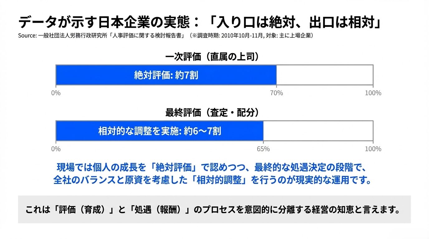 つまり、現場レベルでは「君の目標達成度は素晴らしかった(絶対評価)」と褒めつつ、最終的に給与や賞与を決める経営会議の段階で「全社のバランスと原資を考慮して調整(相対要素)」を行っている可能性が高いのです。但し、本調査データの調査時期は2010年10月~11月と若干古いデータであること、対象は上場企業等を中心とした大企業である点には留意が必要です。