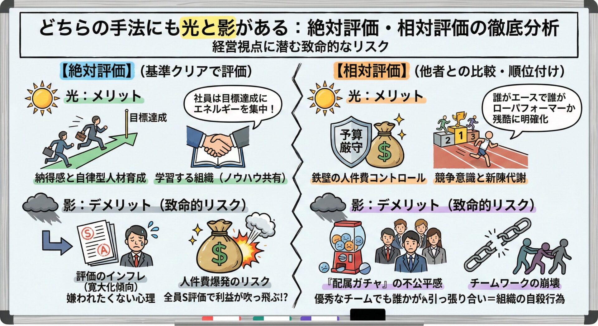 これは「絶対評価は優しくて、相対評価は厳しい」という単純な話ではありません。経営視点で見ると、それぞれに致命的なリスク(影)が潜んでいます。