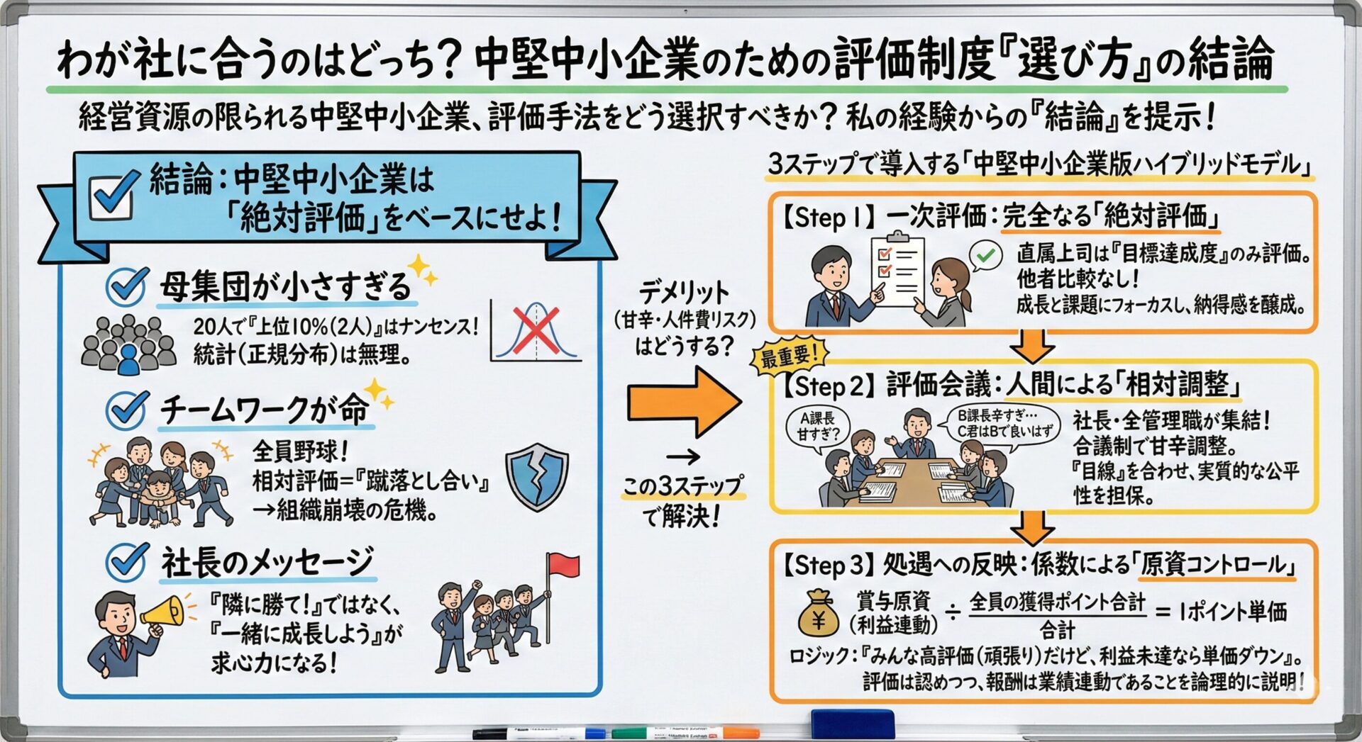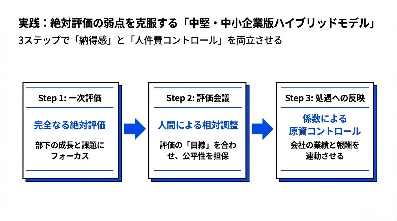 - 現実的な運用: 「入り口は絶対評価、出口は調整のハイブリッド方式」で、社員の納得感と会社の財務規律を両立させる。