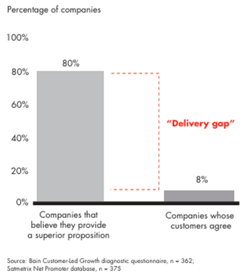 コンサルティング会社ベイン・アンド・カンパニーの調査によると、「自社は優れた顧客体験を提供している」と考える企業は80%に達する一方で、それに同意する顧客はわずか8%しかいないというデータがあります(※引用元:Bain & Company, “Closing the Delivery Gap“)。
