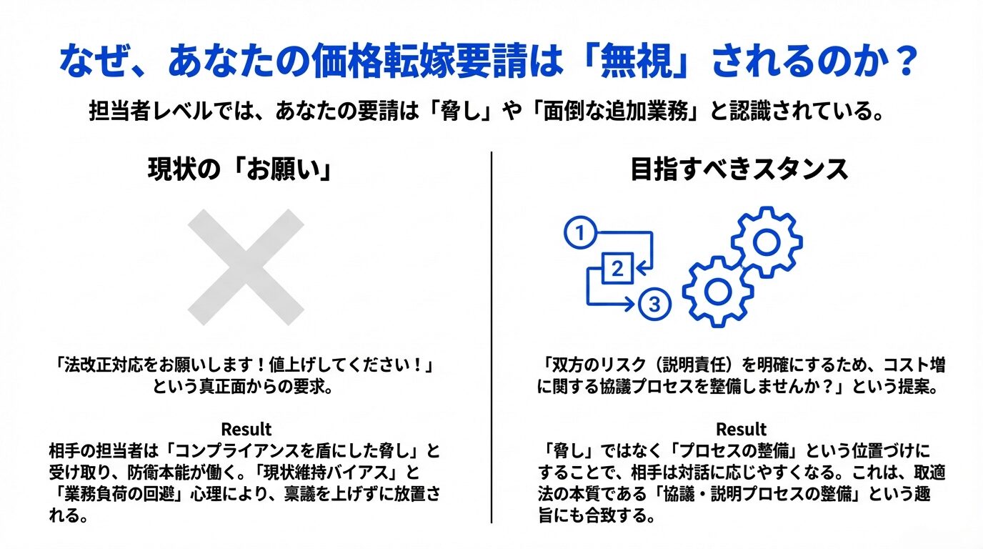 調達担当者にとって、価格改定の稟議は膨大なエネルギーを要する業務です。ここでいきなり「法改正対応をお願いします!値上げしてください!」と真正面からぶつかると、相手は「コンプライアンスを盾にした脅し」と受け取り、防衛本能が働きます。