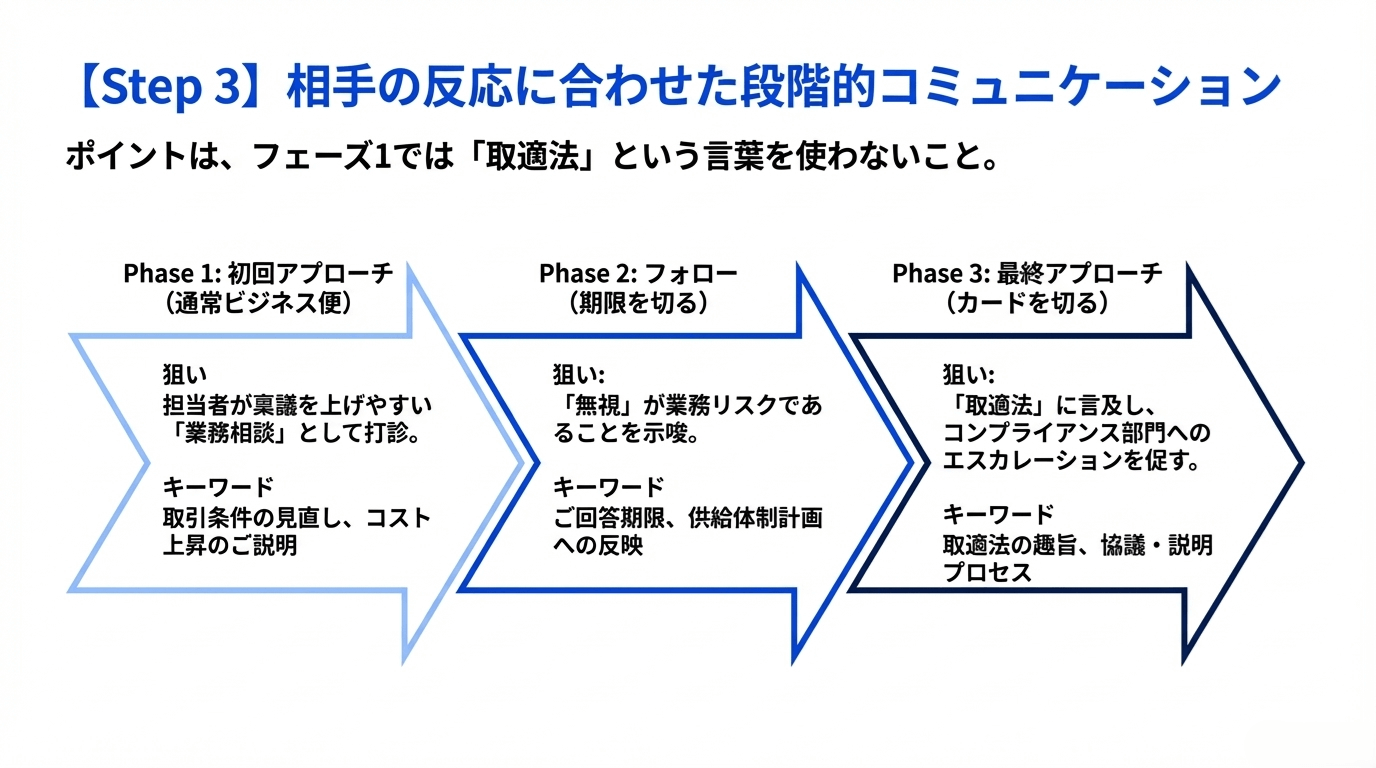 ポイントは、フェーズ1では「取適法」「制度改正」といった言葉を使わないこと。まずは通常の業務相談として通し、相手が動かない場合のみ段階的にトーンを上げます。