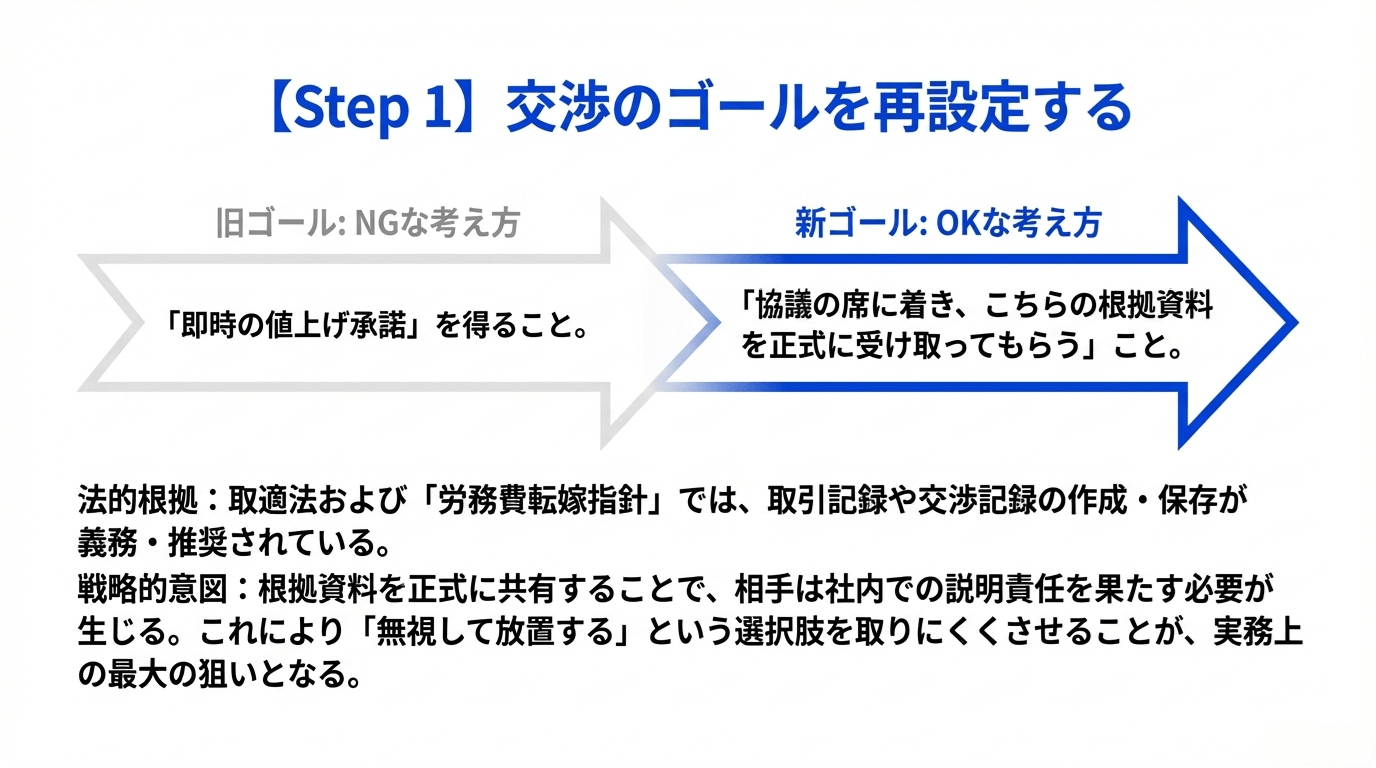 ゴール設定を変えましょう。「即時の値上げ承諾」を目指すのではなく、「協議の席に着き、こちらの根拠資料を正式に受け取ってもらうこと」を第一目標にします。
