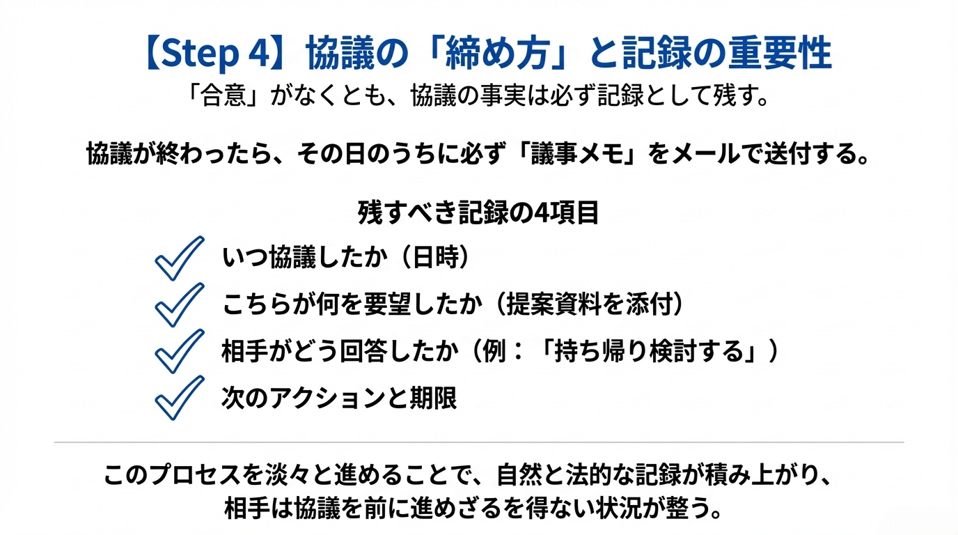 このプロセスを淡々と進めることで、自然と法的な記録が積み上がり、協議を前に進めざるを得ない状況が整います。