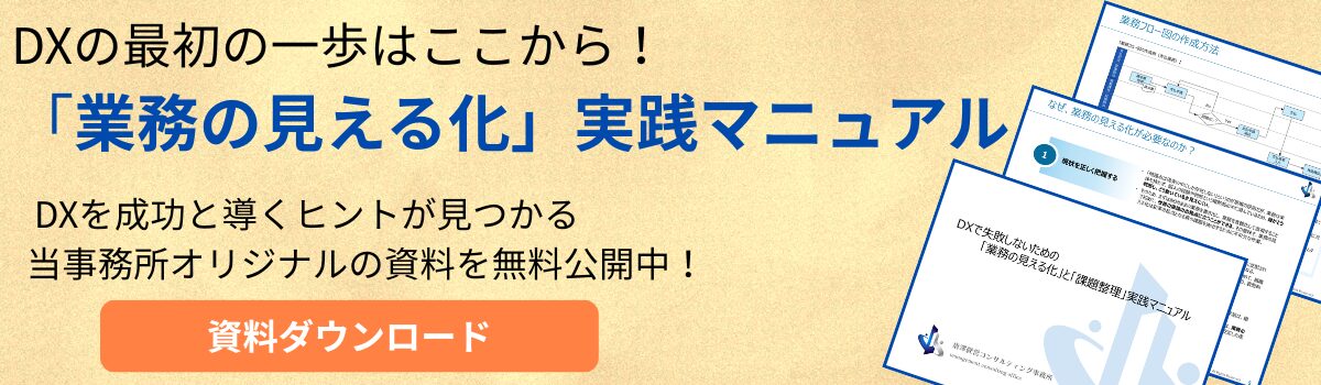 当事務所のオリジナル資料「DXで失敗しないための「業務の見える化」と「課題整理」実践マニュアル」を無料で公開しています。以下よりダウンロードの上、ご活用ください。