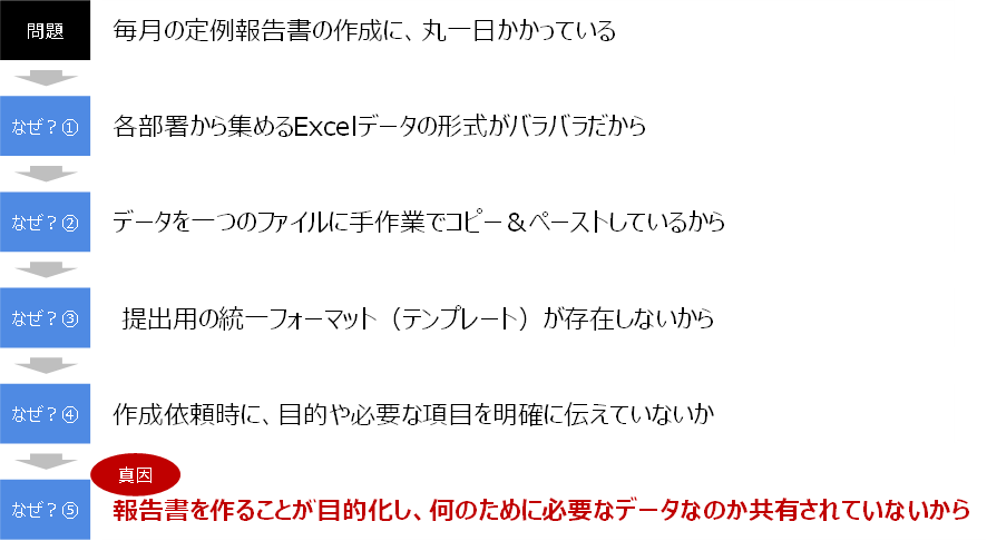 例えば、「毎月の定例報告書の作成に丸一日かかっている」という問題を考えてみましょう。この問題に対するなぜなぜ分析は以下のようになります。