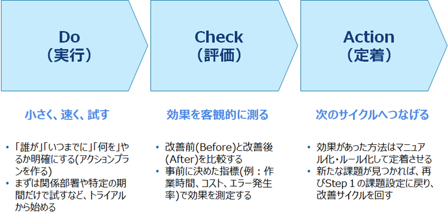 - Do(実行):小さく、速く、試す 「誰が」「いつまでに」「何を」やるかを明確にしたアクションプランを作成します。いきなり全社展開するのではなく、特定の部署や期間で「トライアル」から始めることで、リスクを抑えながら改善の精度を高めることができます。
