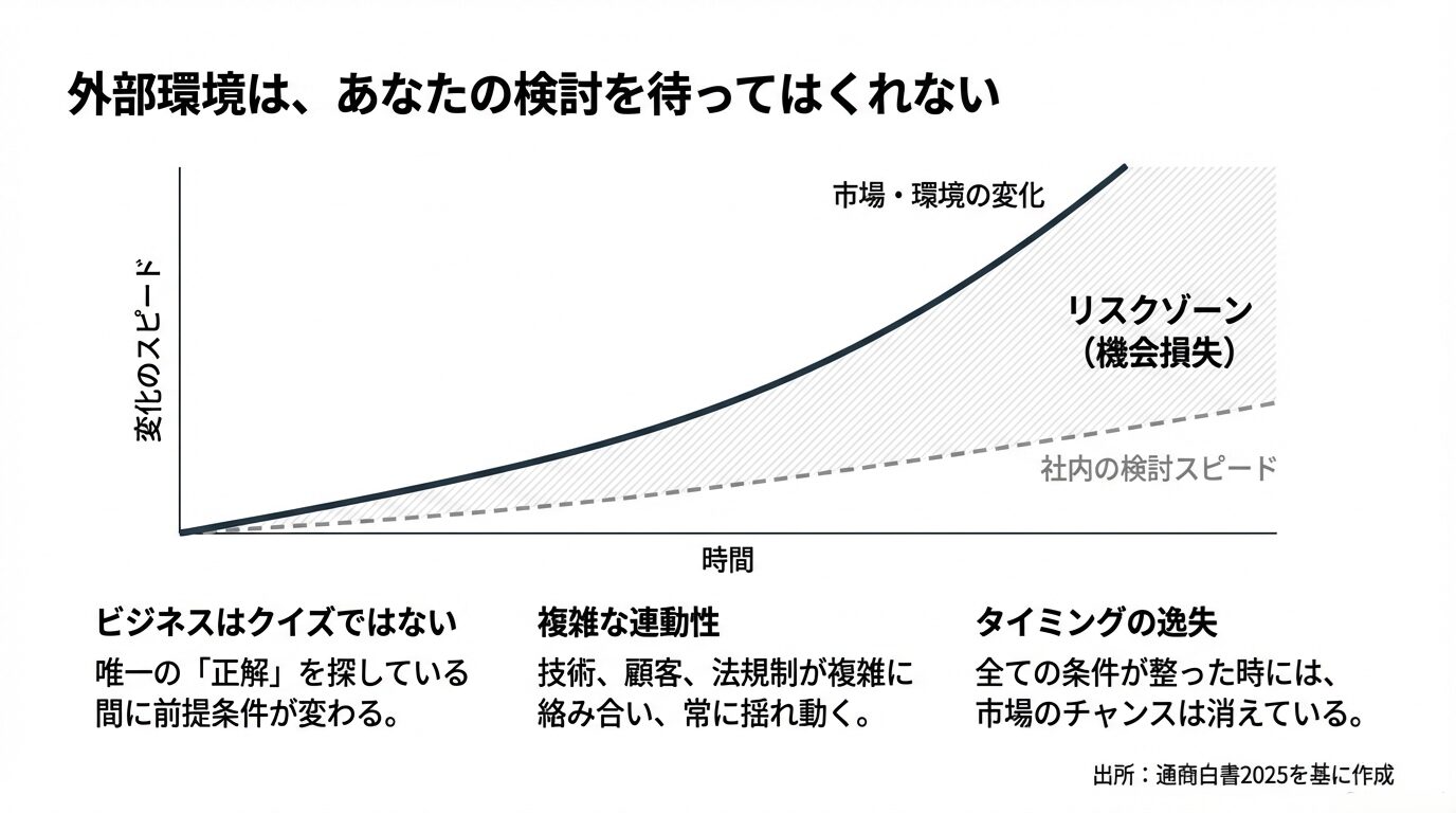 つまり、経営判断は常に「前提条件が揺らぐこと」を織り込んで行う必要があります。「全ての条件が整ってから動く」という考え方自体が、現代のスピード感には合わなくなっているのです。